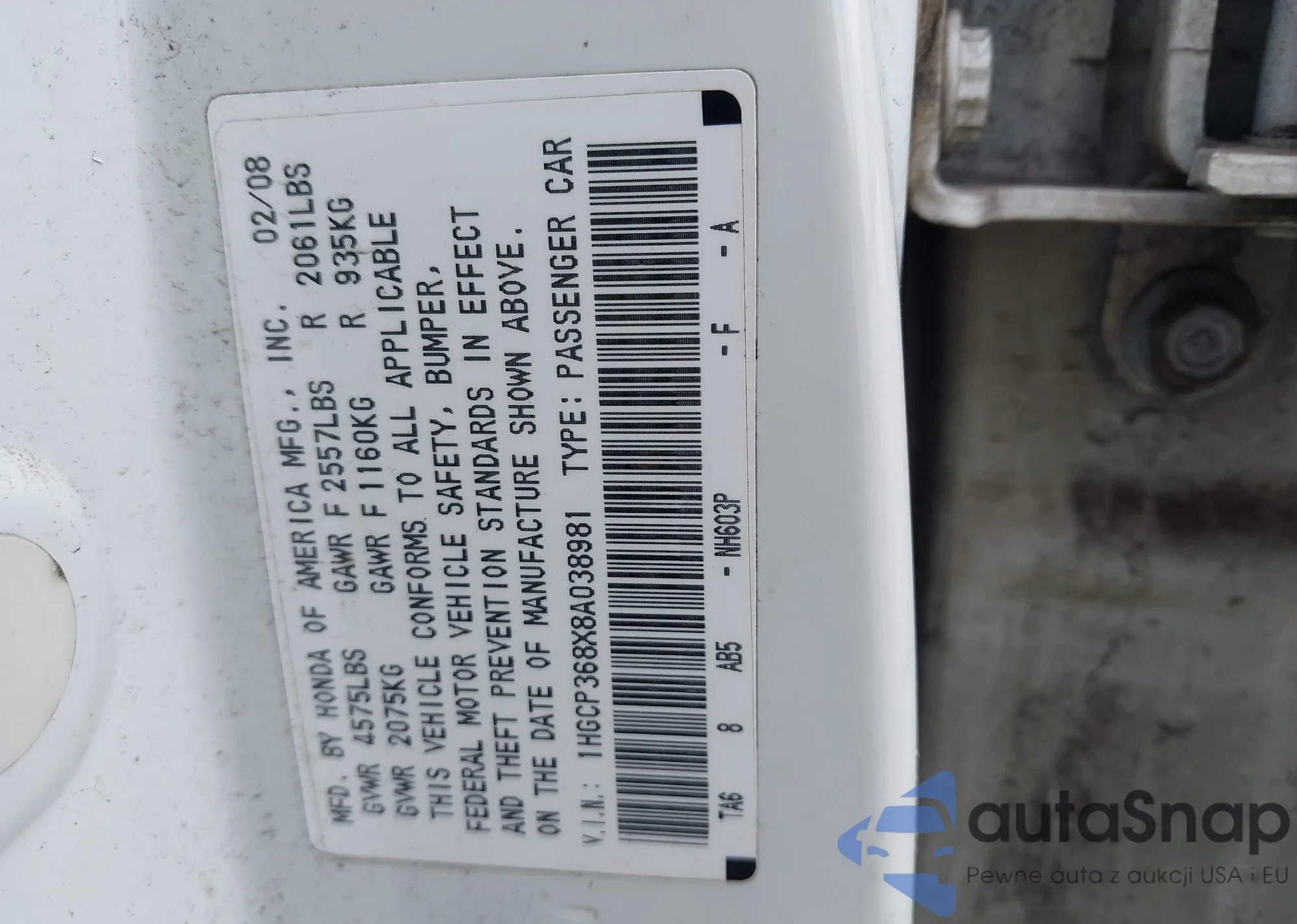 LOT: 41904313 VIN: 1HGCP368X8A038981