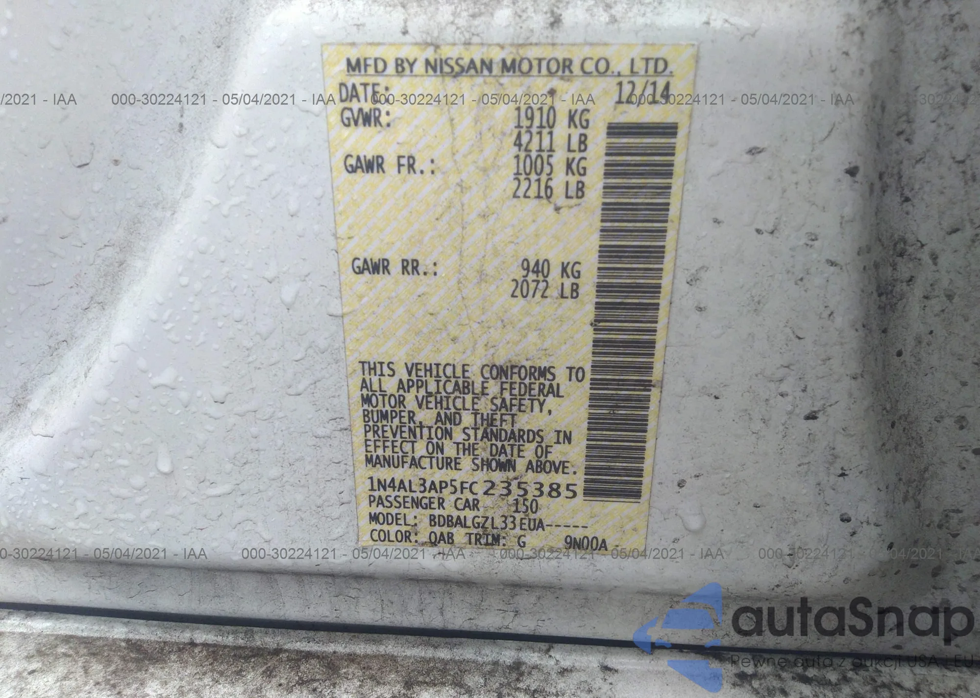LOT: 30224121 VIN: 1N4AL3AP5FC235385