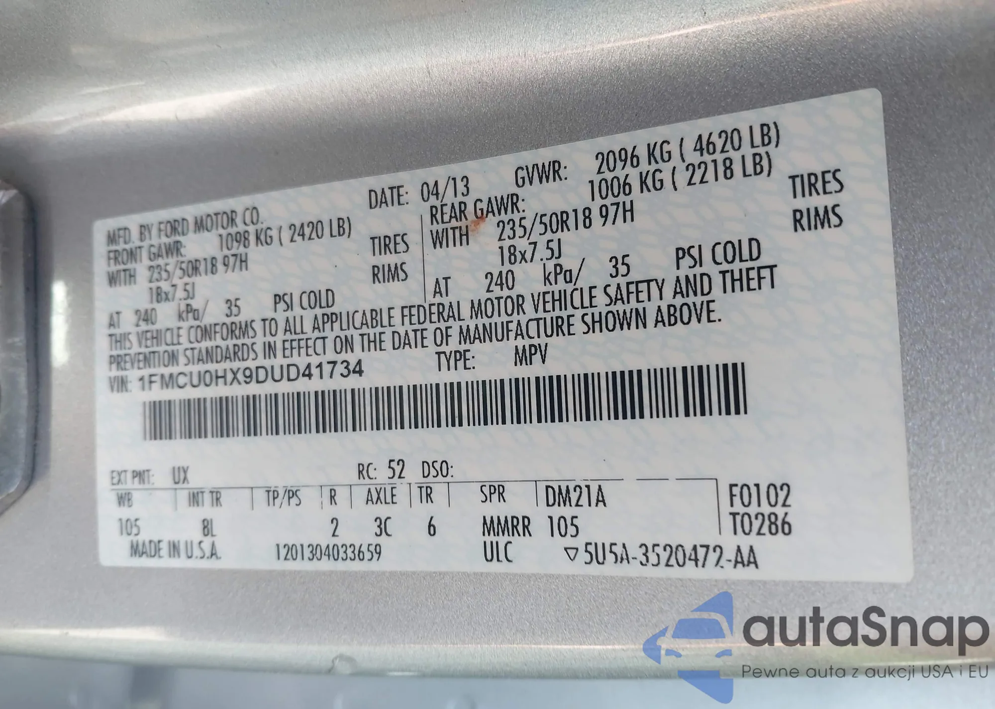 LOT: 41704686 VIN: 1FMCU0HX9DUD41734