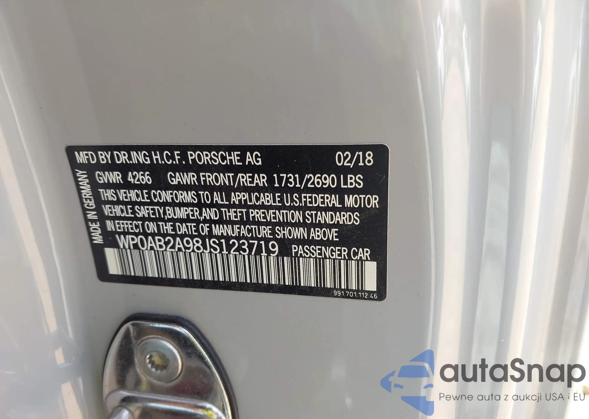 LOT: 42102385 VIN: WP0AB2A98JS123719