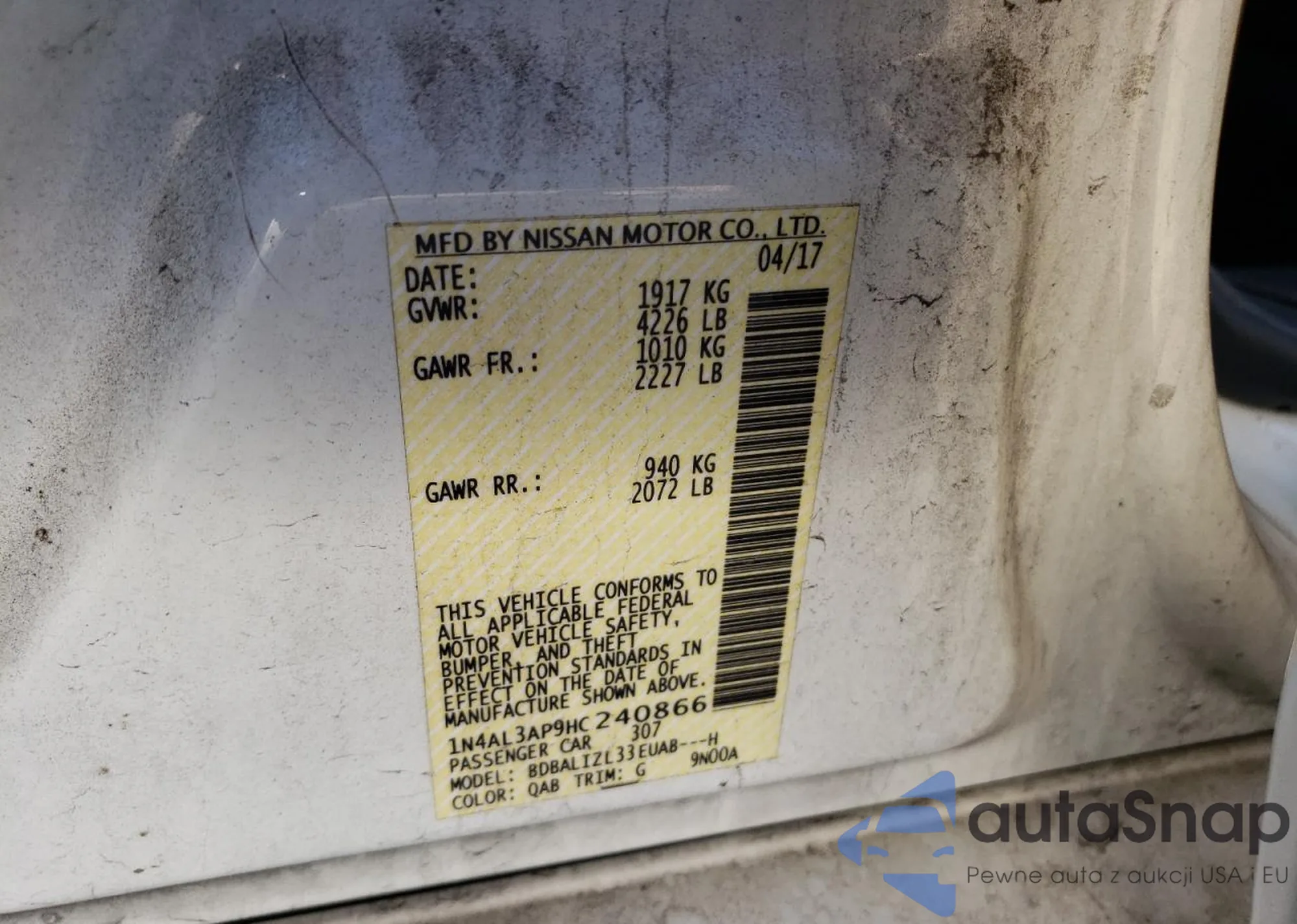 • VIN 1N4AL3AP9HC240866