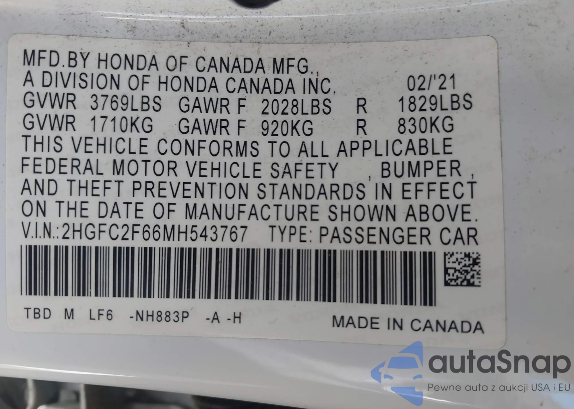 • VIN 2HGFC2F66MH543767