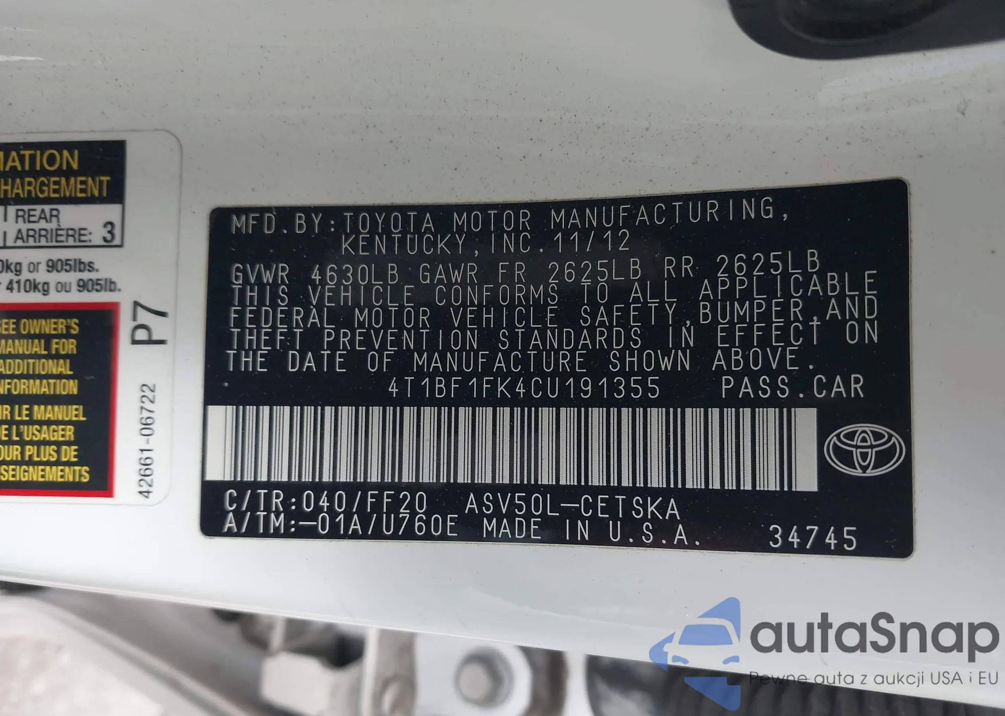 • VIN 4T1BF1FK4CU191355