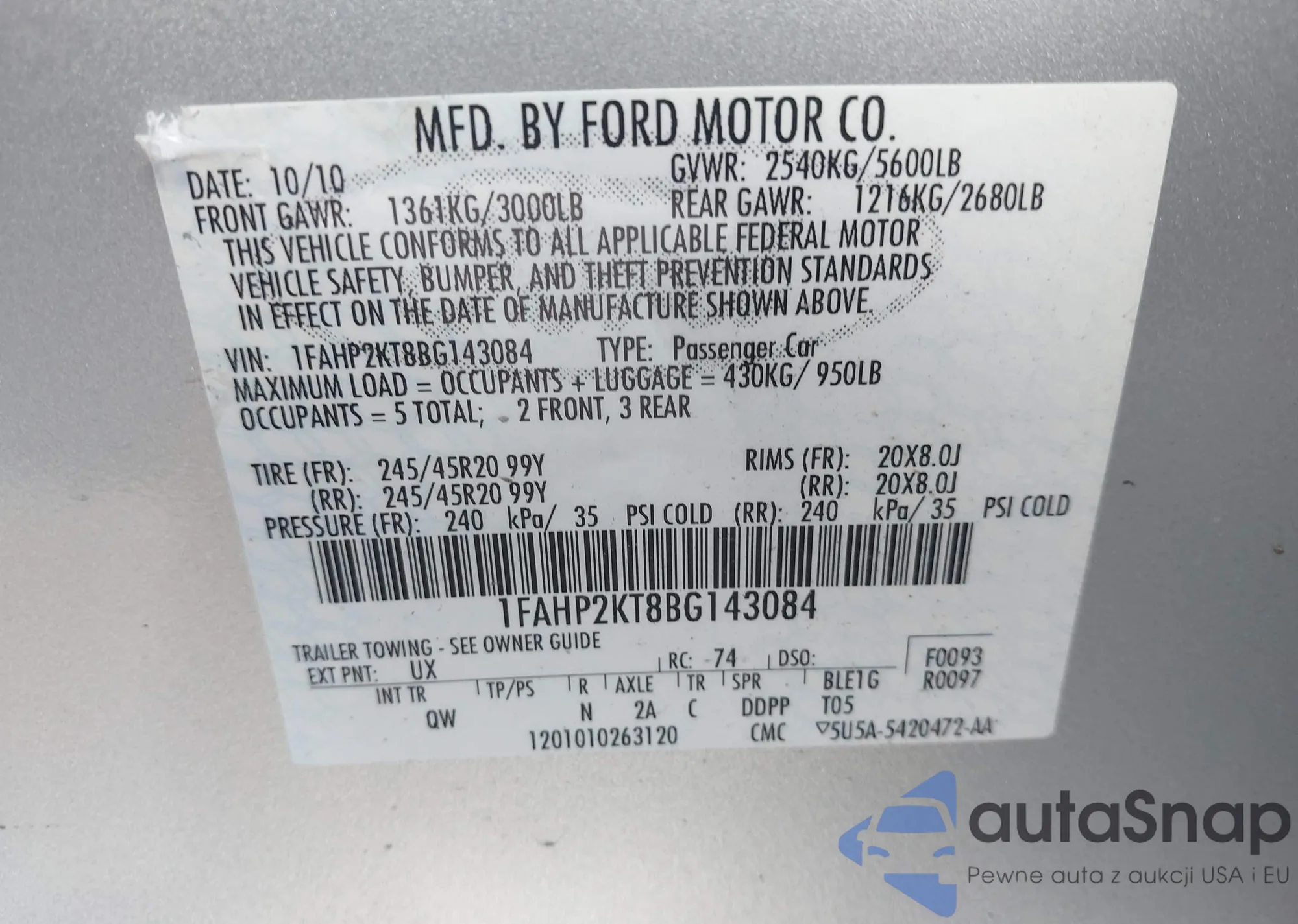 • VIN 1FAHP2KT8BG143084