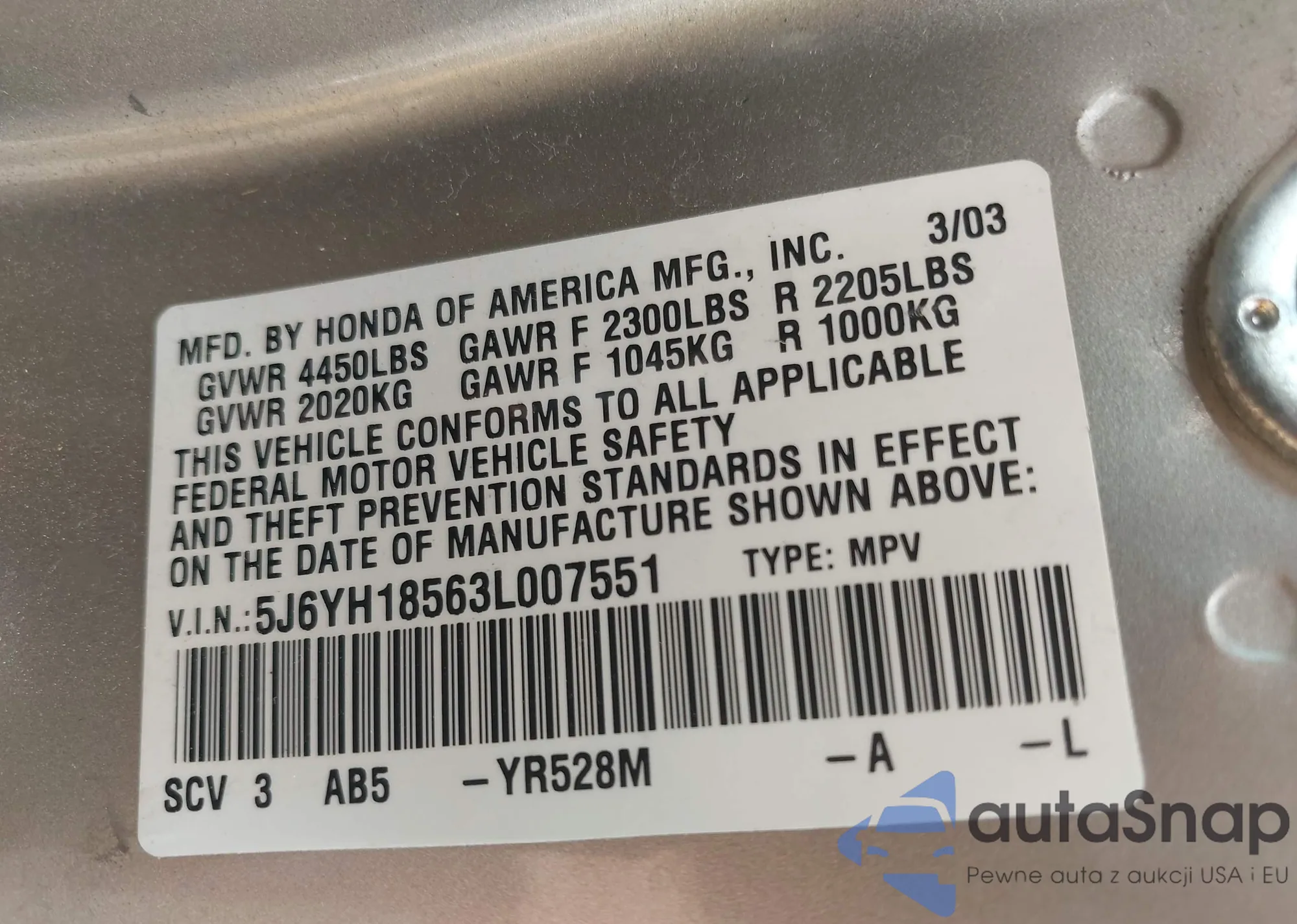 • VIN 5J6YH18563L007551