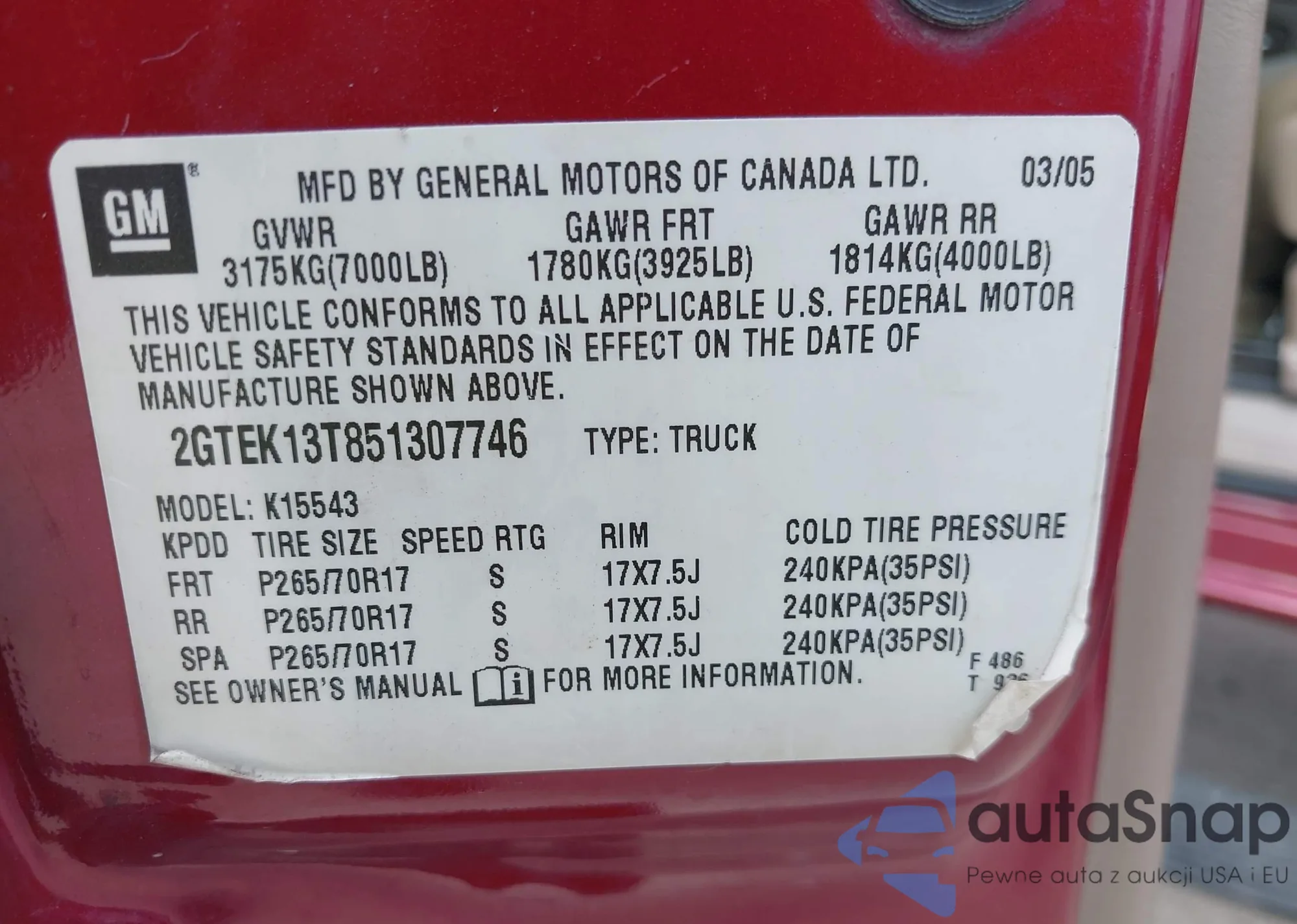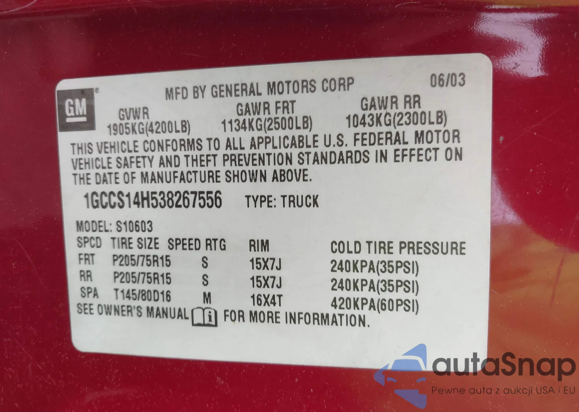 • VIN 1GCCS14H538267556