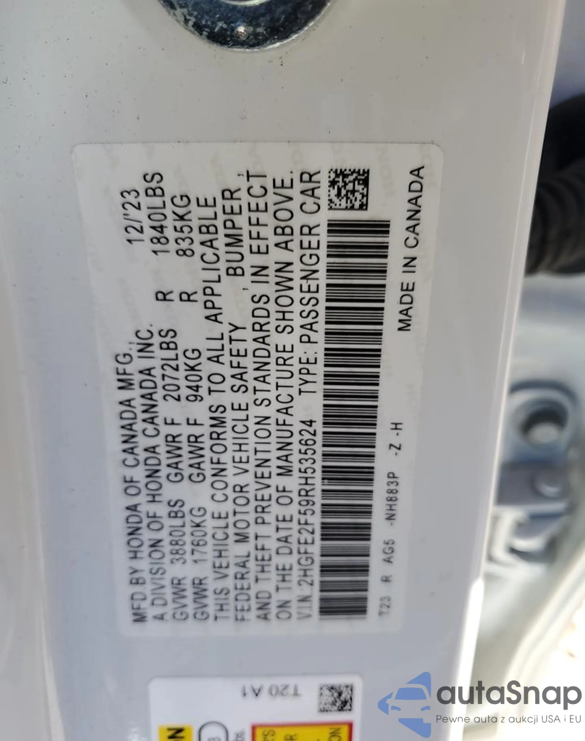 LOT: 47251335 VIN: 2HGFE2F59RH535624