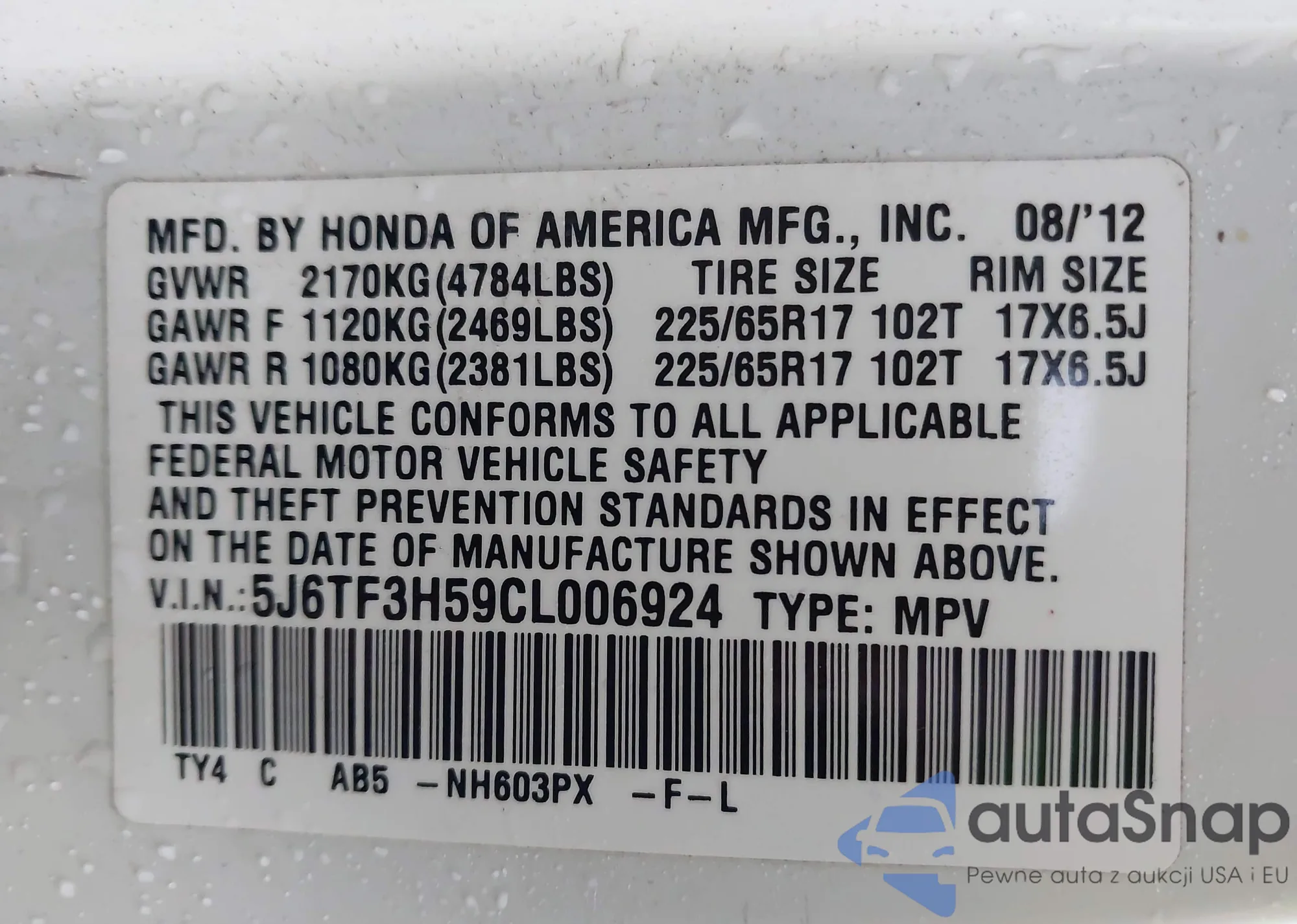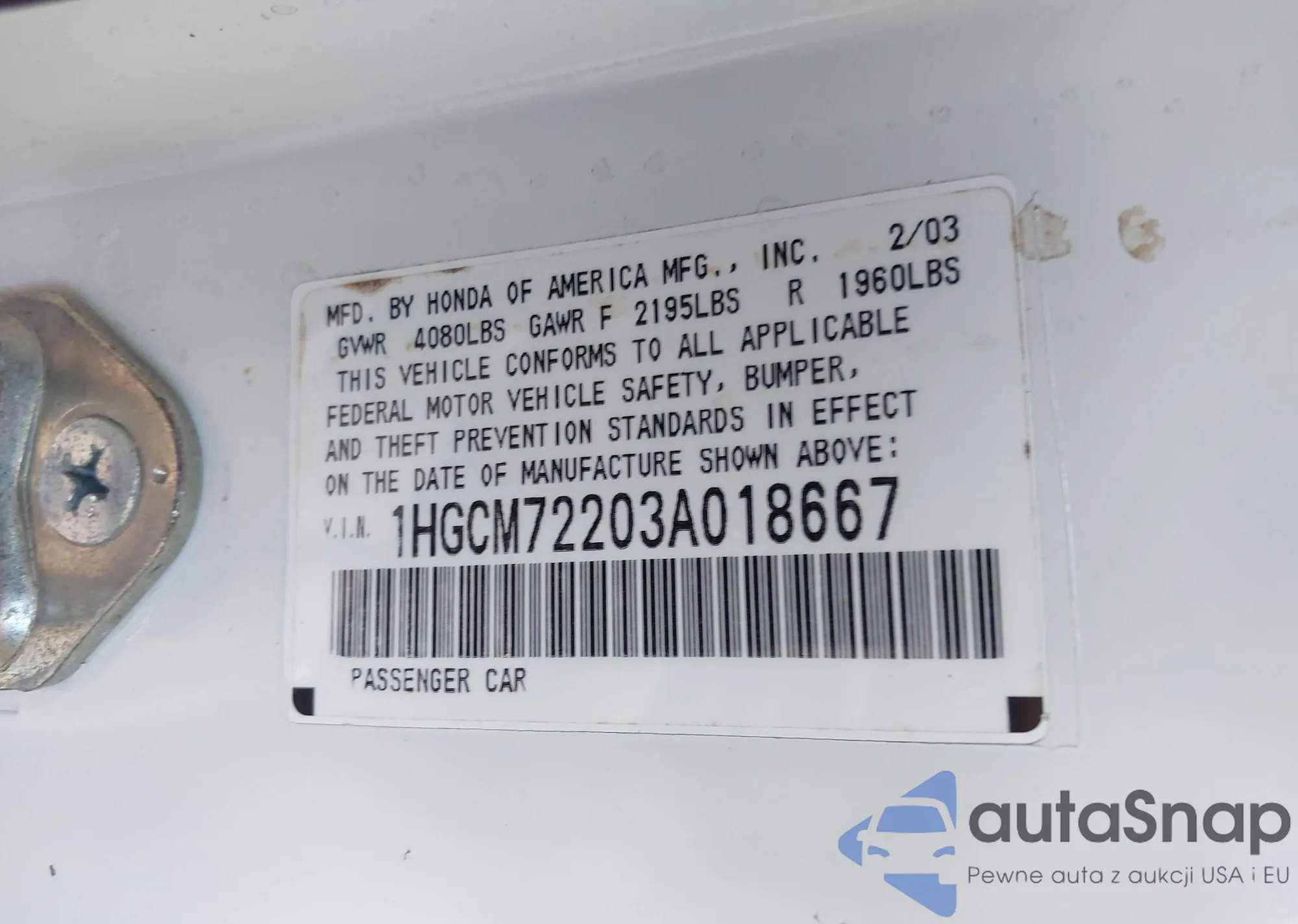 LOT: 39474740 VIN: 1HGCM72203A018667