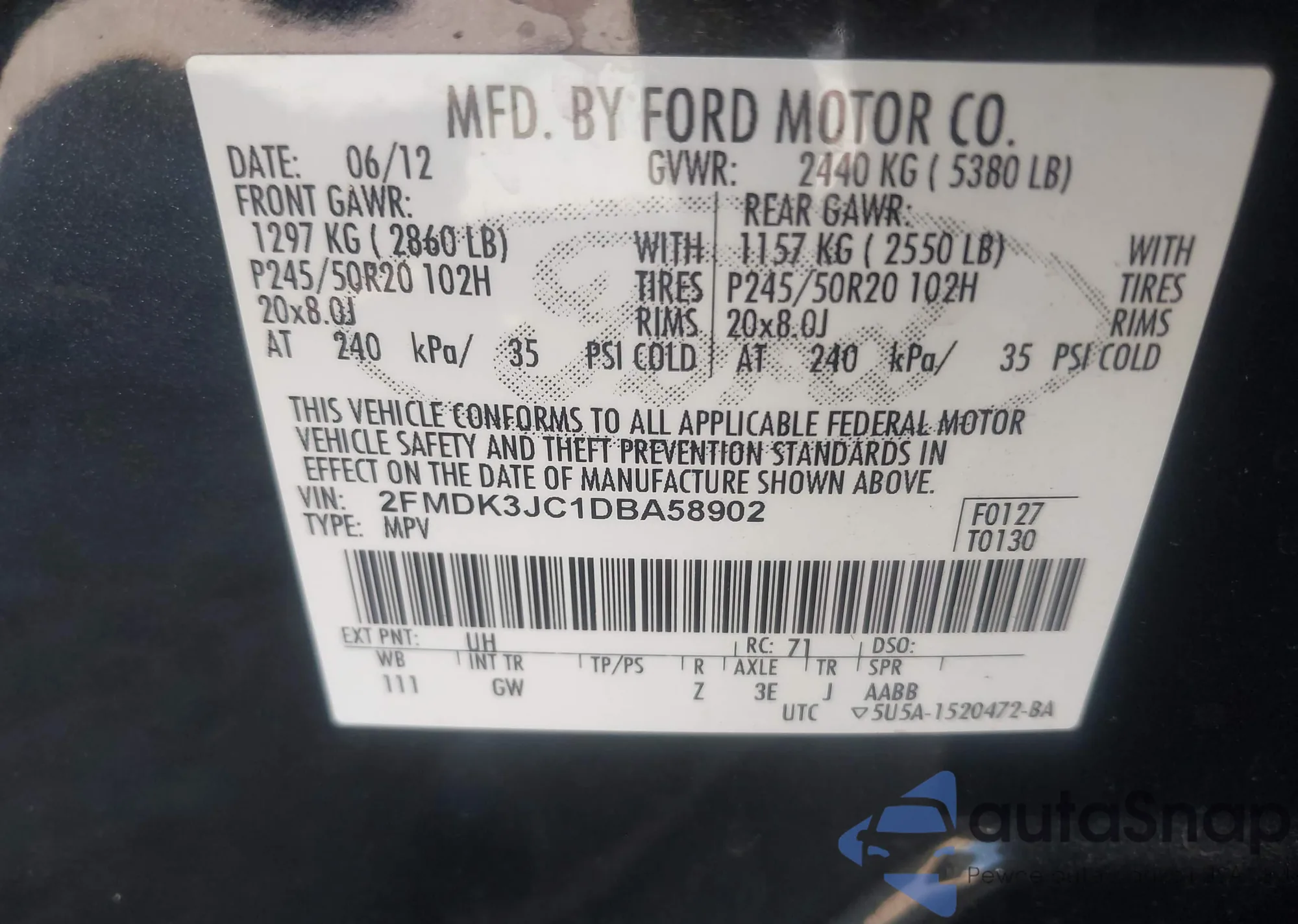 LOT: 42112569 VIN: 2FMDK3JC1DBA58902