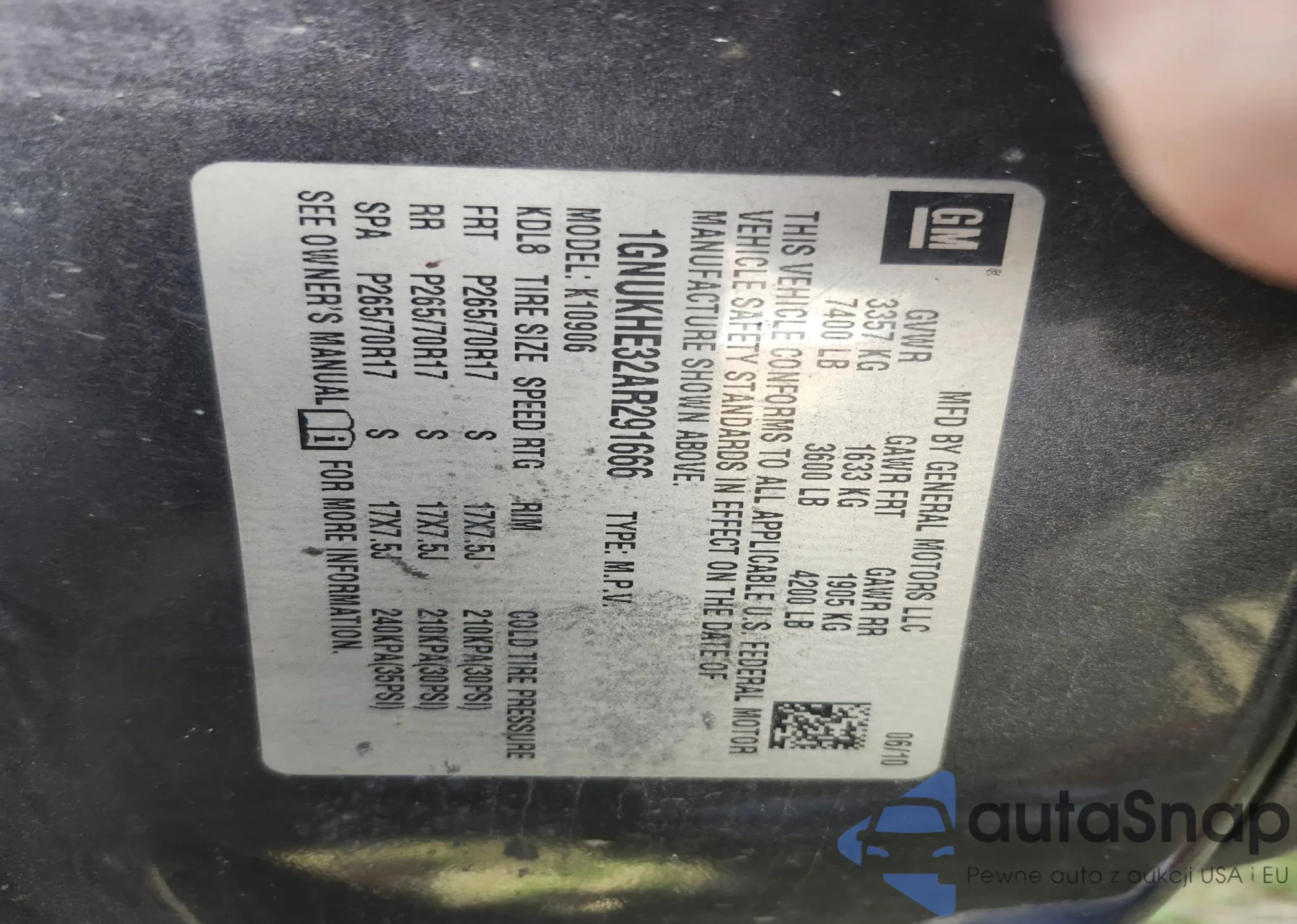 LOT: 41886401 VIN: 1GNUKHE32AR291666