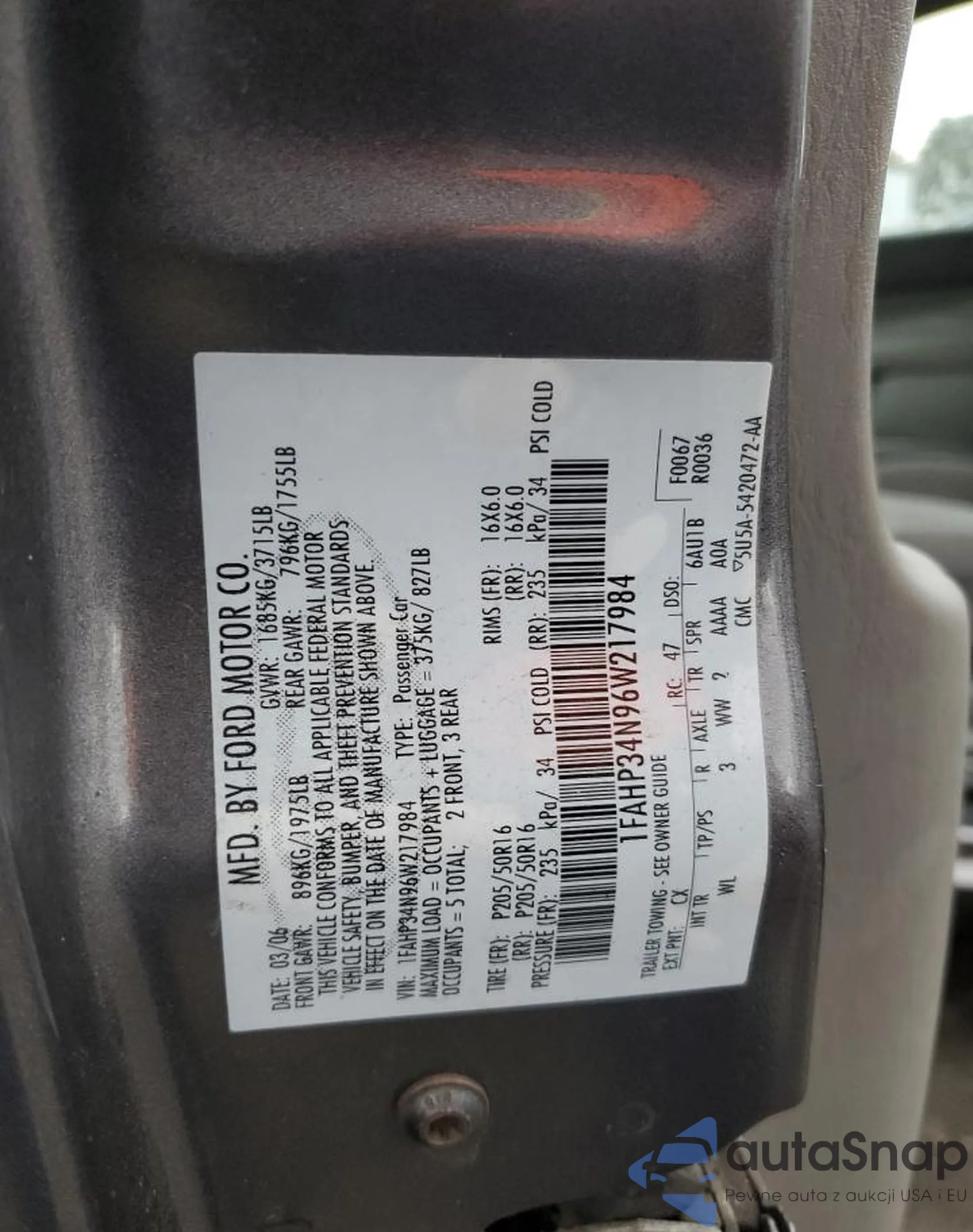 LOT: 48208895 VIN: 1FAHP34N96W217984