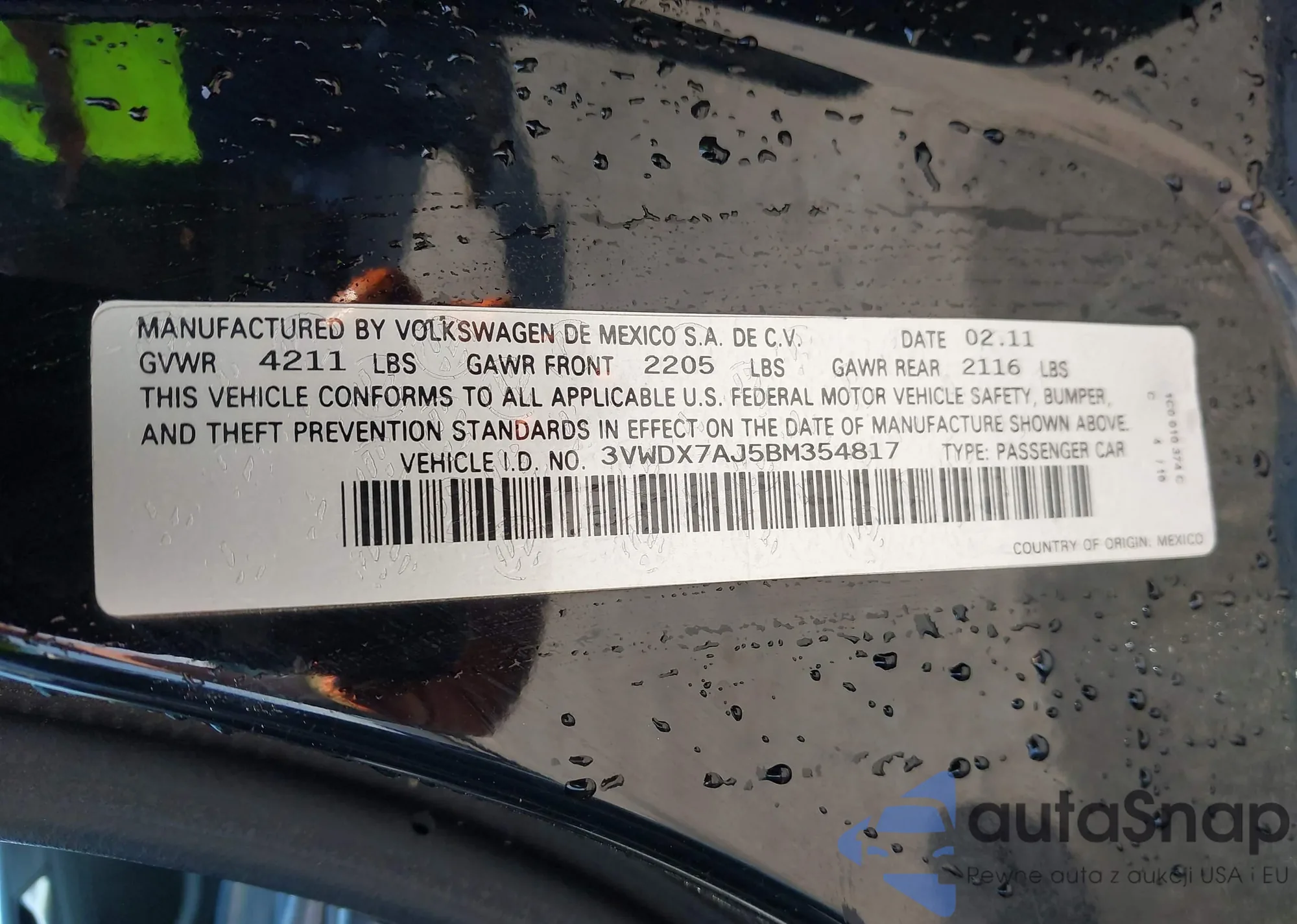 • VIN 3VWDX7AJ5BM354817