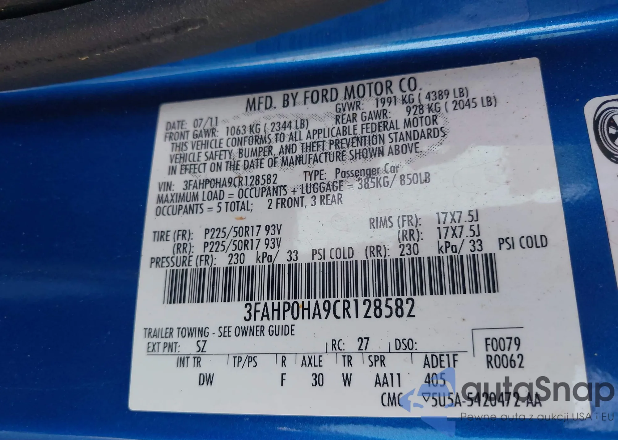 • VIN 3FAHP0HA9CR128582