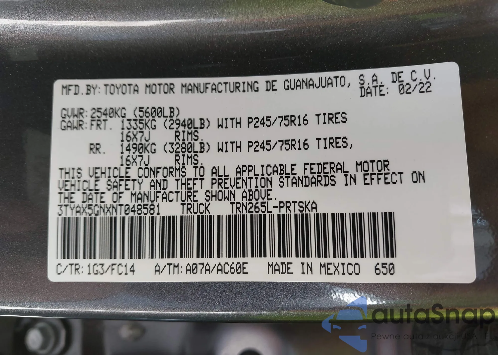 • VIN 3TYAX5GNXNT048581