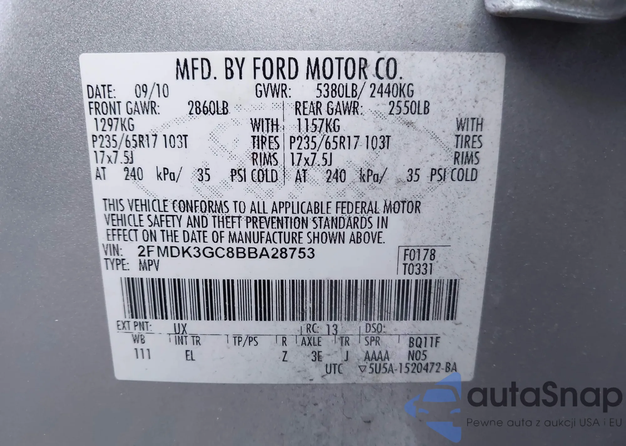 LOT: 41361270 VIN: 2FMDK3GC8BBA28753