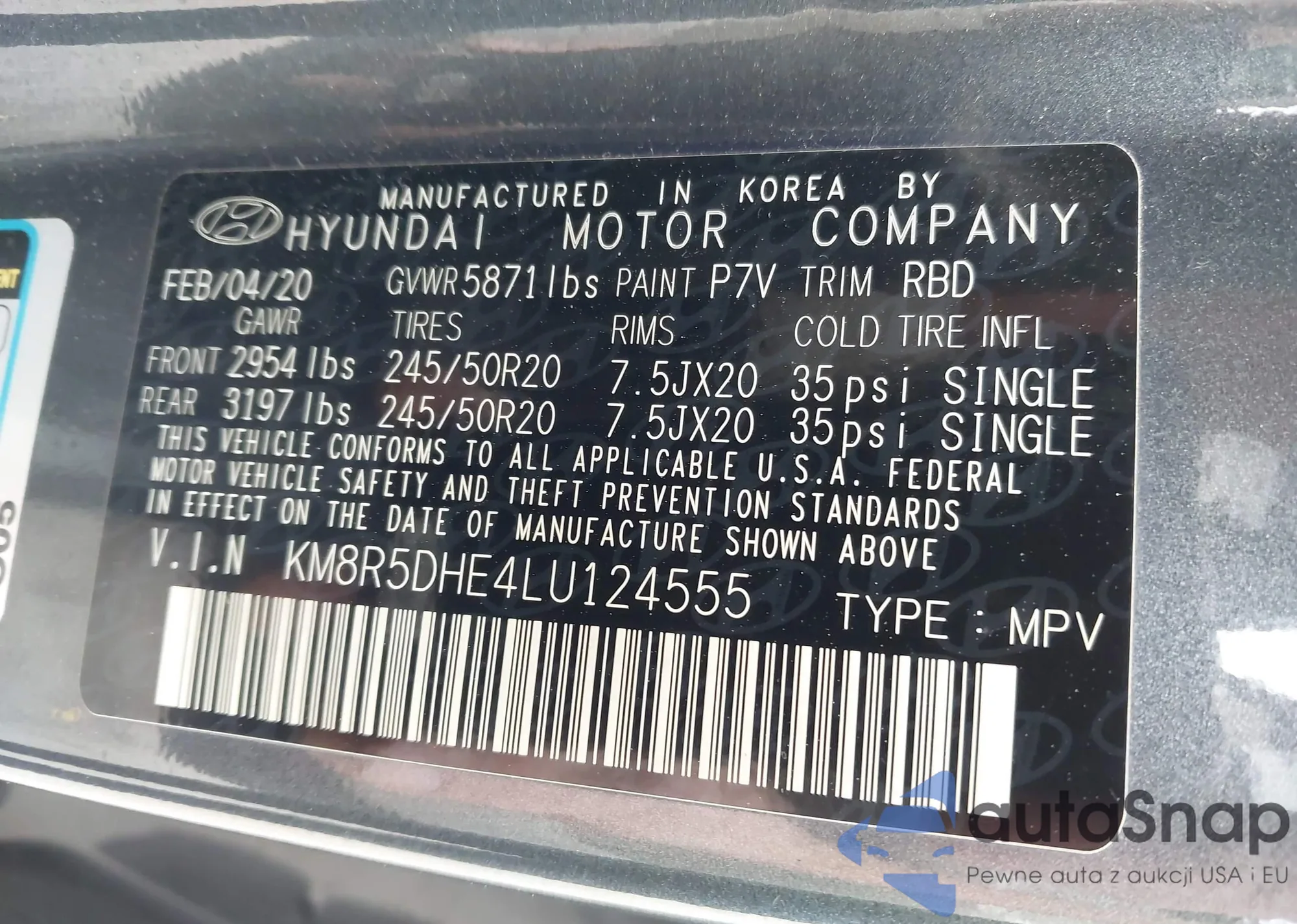 LOT: 42119392 VIN: KM8R5DHE4LU124555