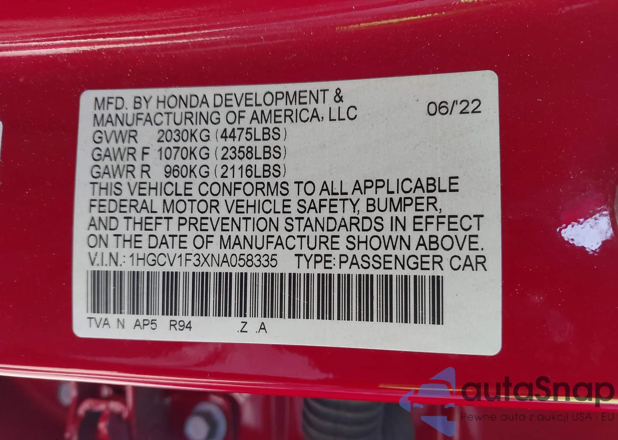 • VIN 1HGCV1F3XNA058335
