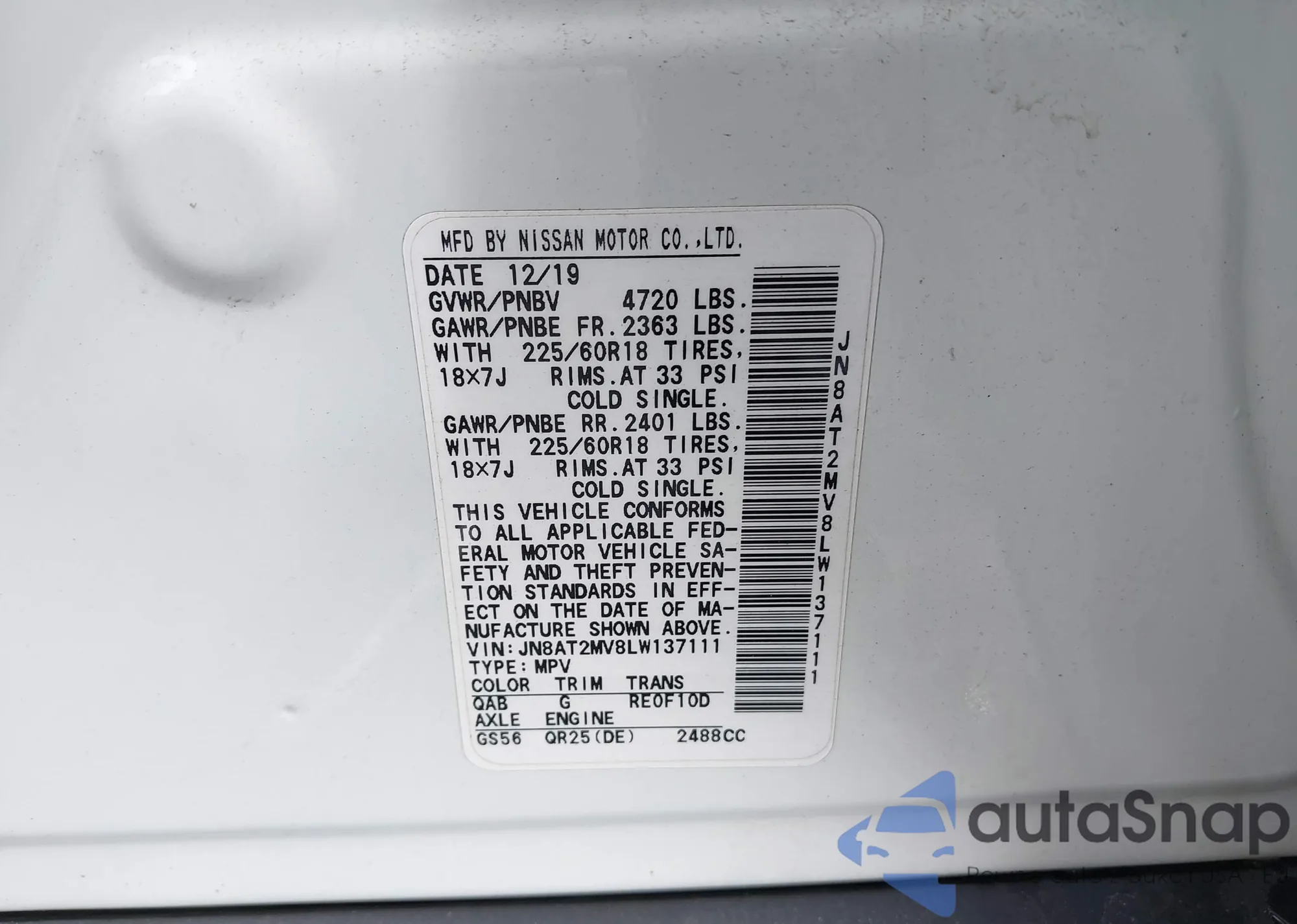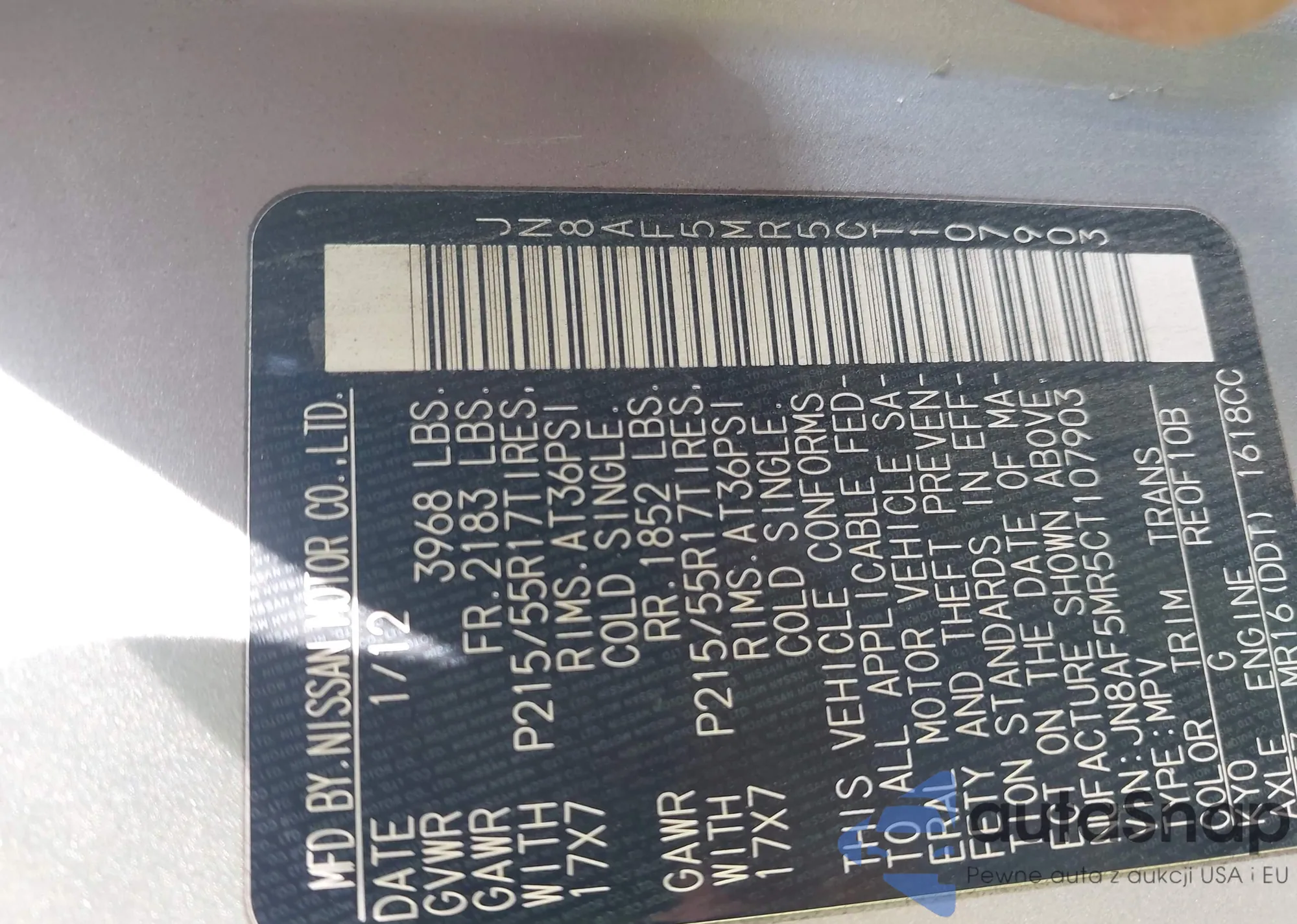 LOT: 42163037 VIN: JN8AF5MR5CT107903