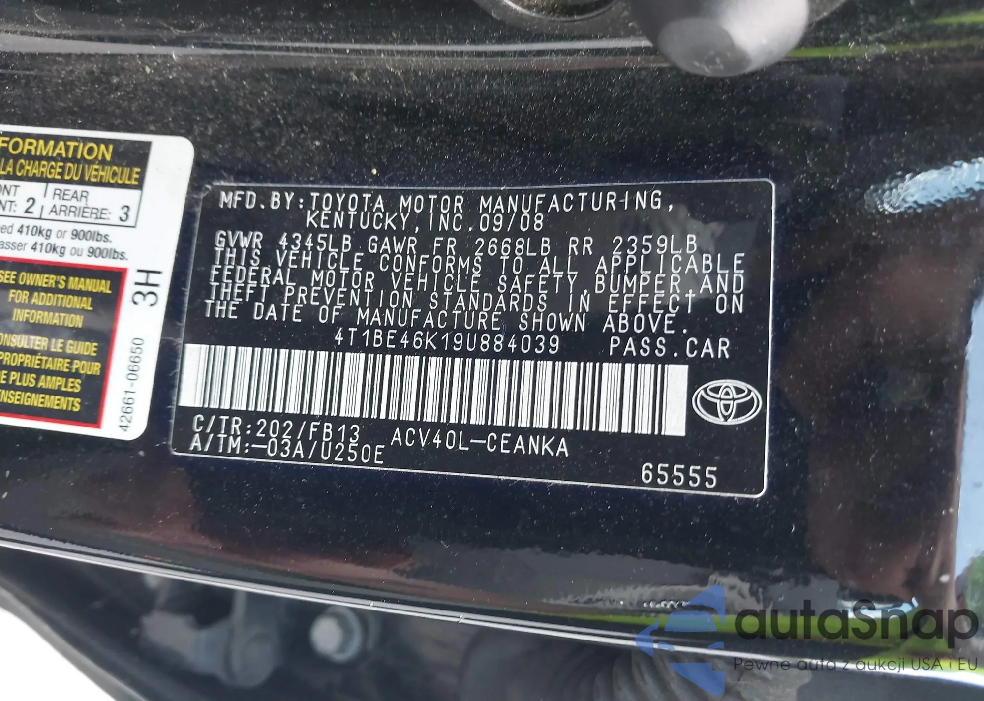 LOT: 40101063 VIN: 4T1BE46K19U884039