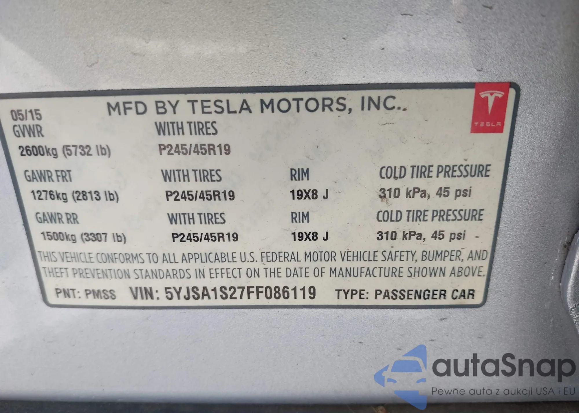 • VIN 5YJSA1S27FF086119