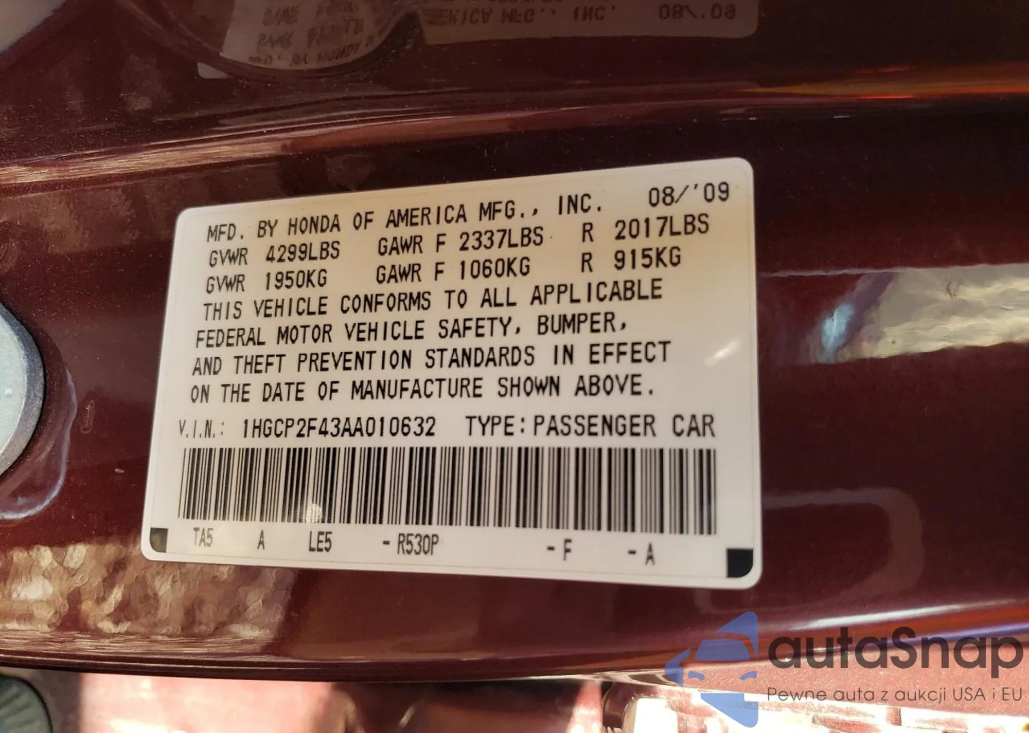 LOT: 78417034 VIN: 1HGCP2F43AA010632