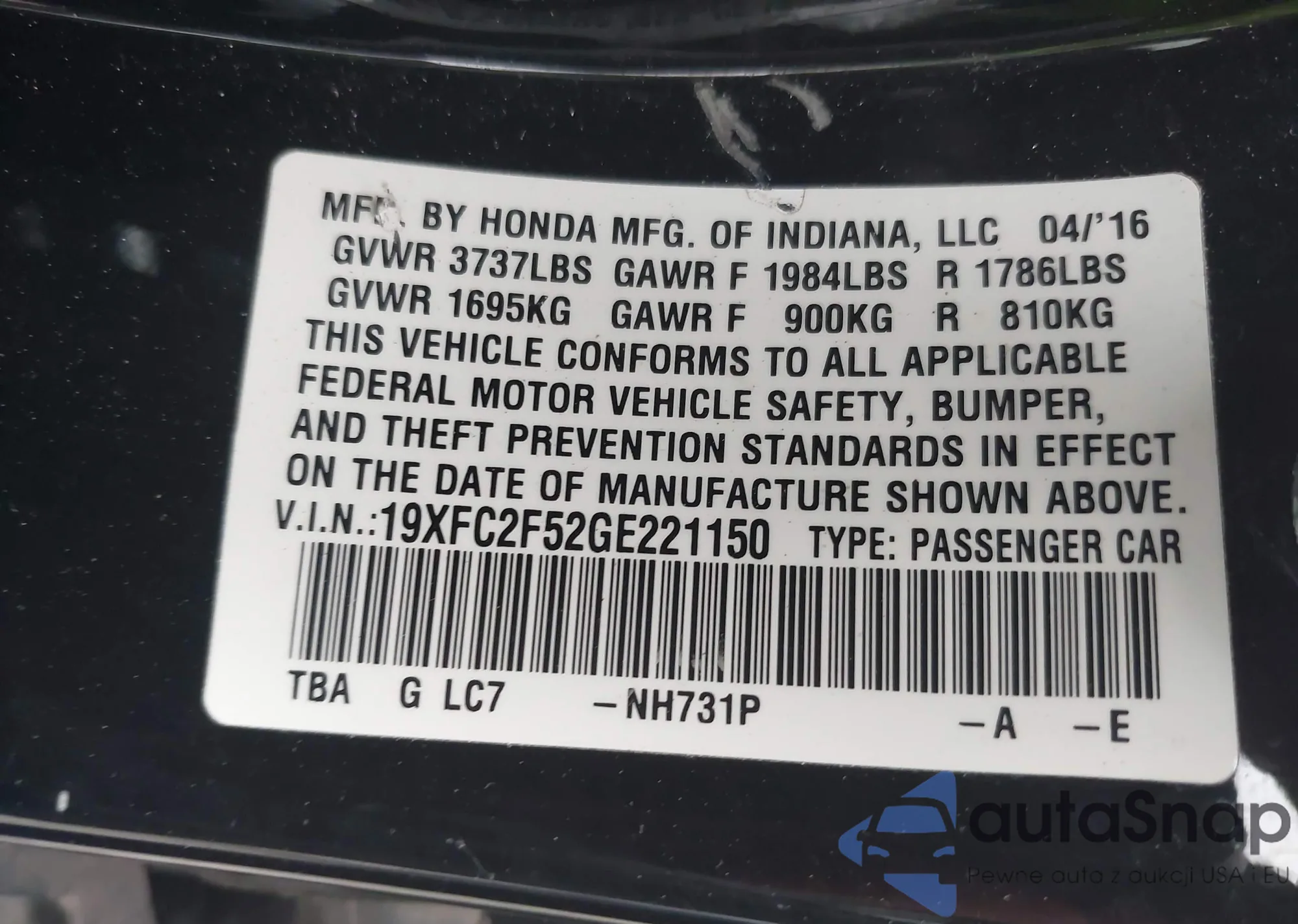 • VIN 19XFC2F52GE221150