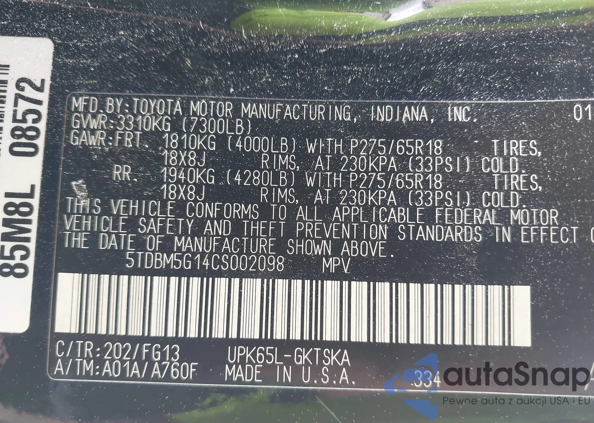 LOT: 42003847 VIN: 5TDBM5G14CS002098