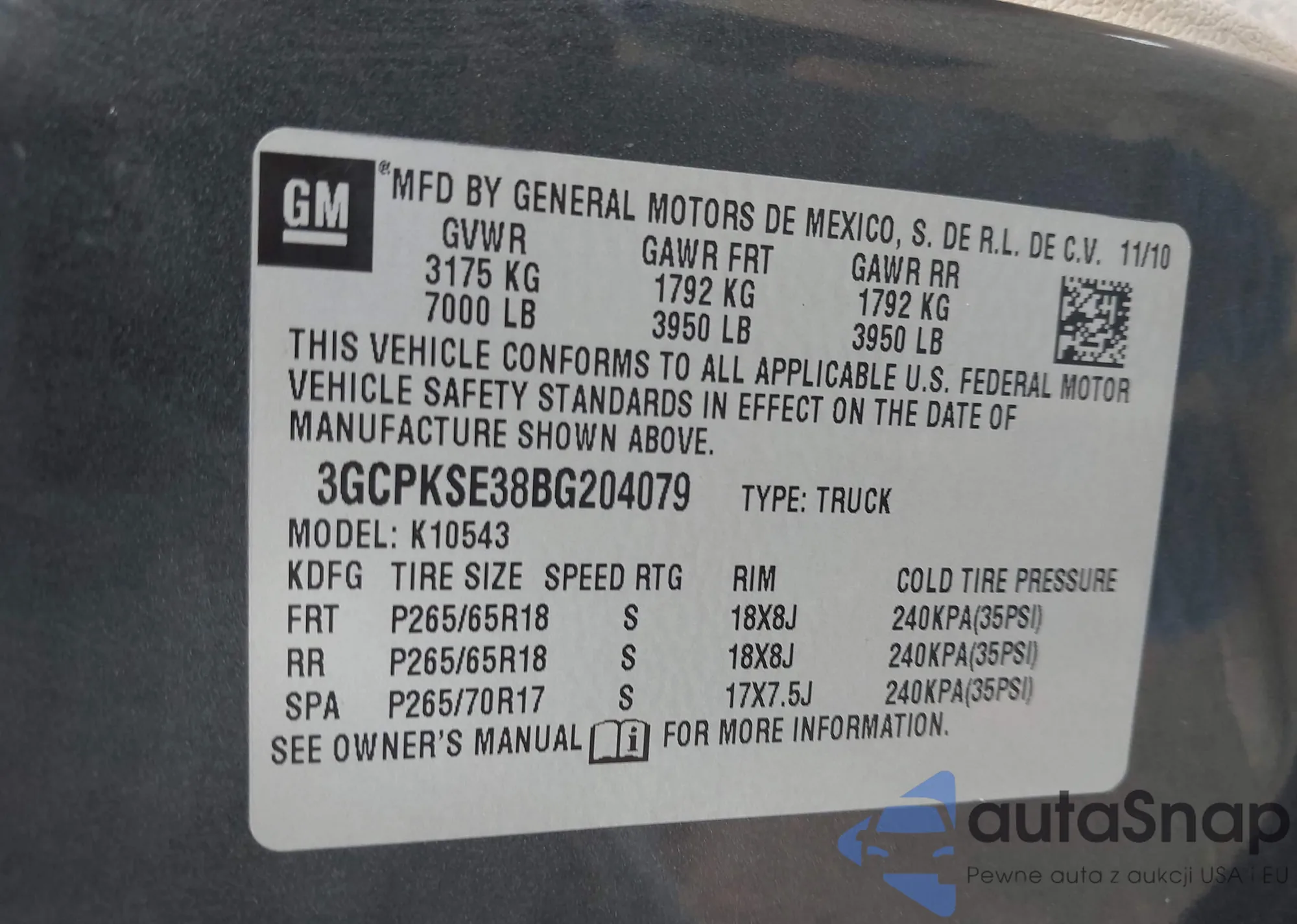 • VIN 3GCPKSE38BG204079
