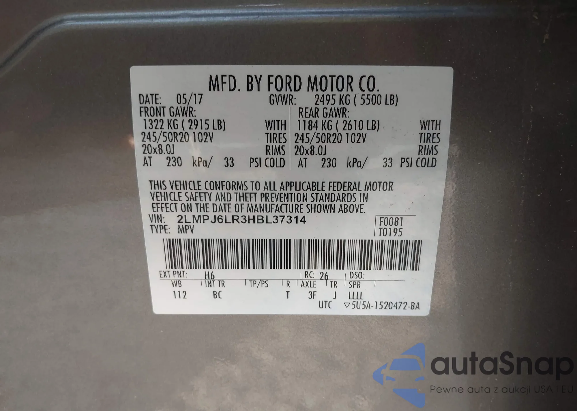 LOT: 39215769 VIN: 2LMPJ6LR3HBL37314
