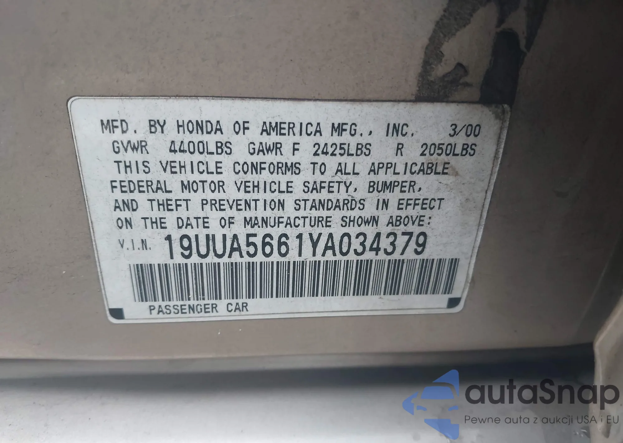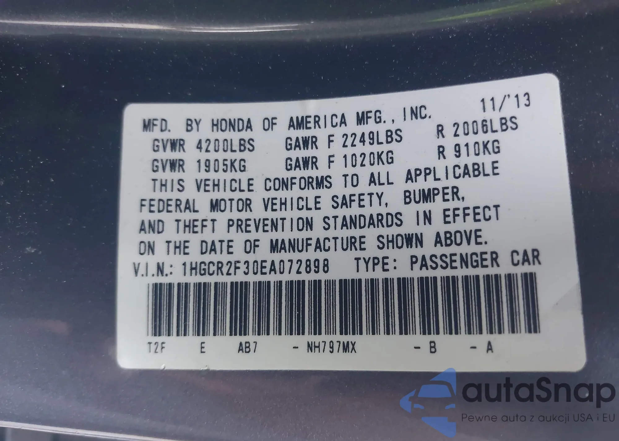 LOT: 42228150 VIN: 1HGCR2F30EA072898
