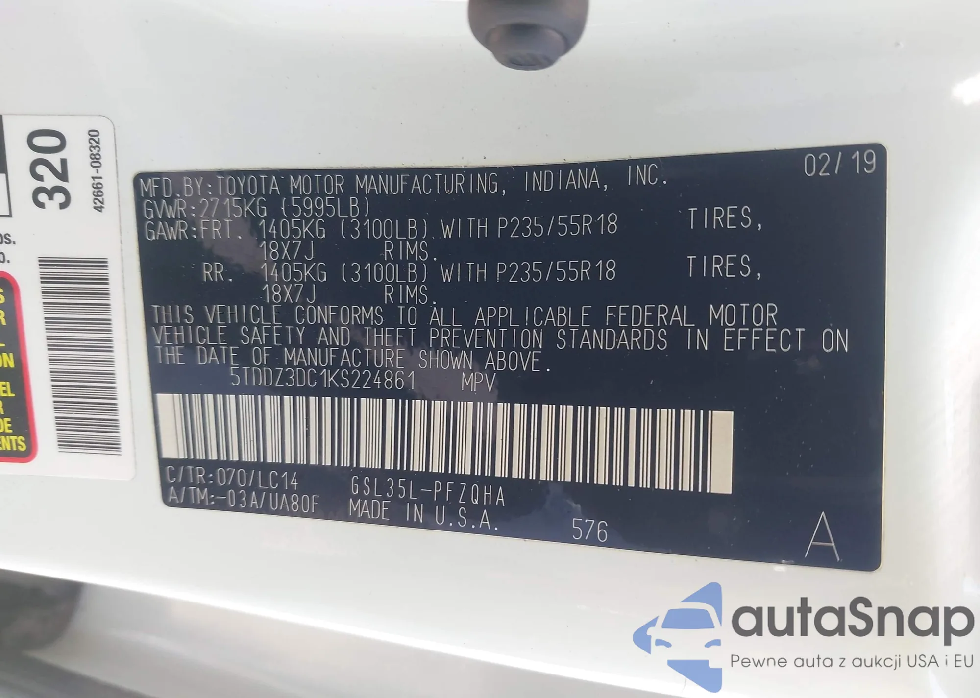 • VIN 5TDDZ3DC1KS224861