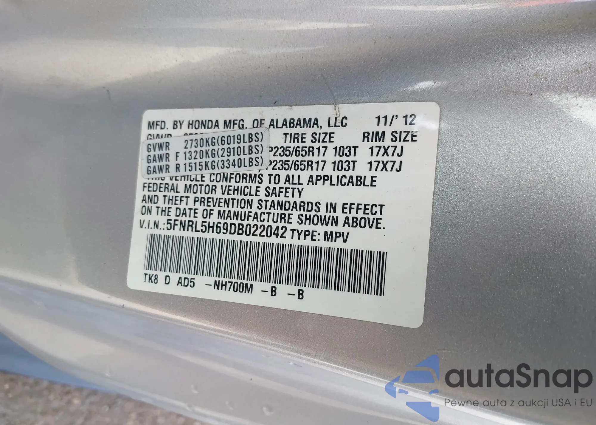 • VIN 5FNRL5H69DB022042