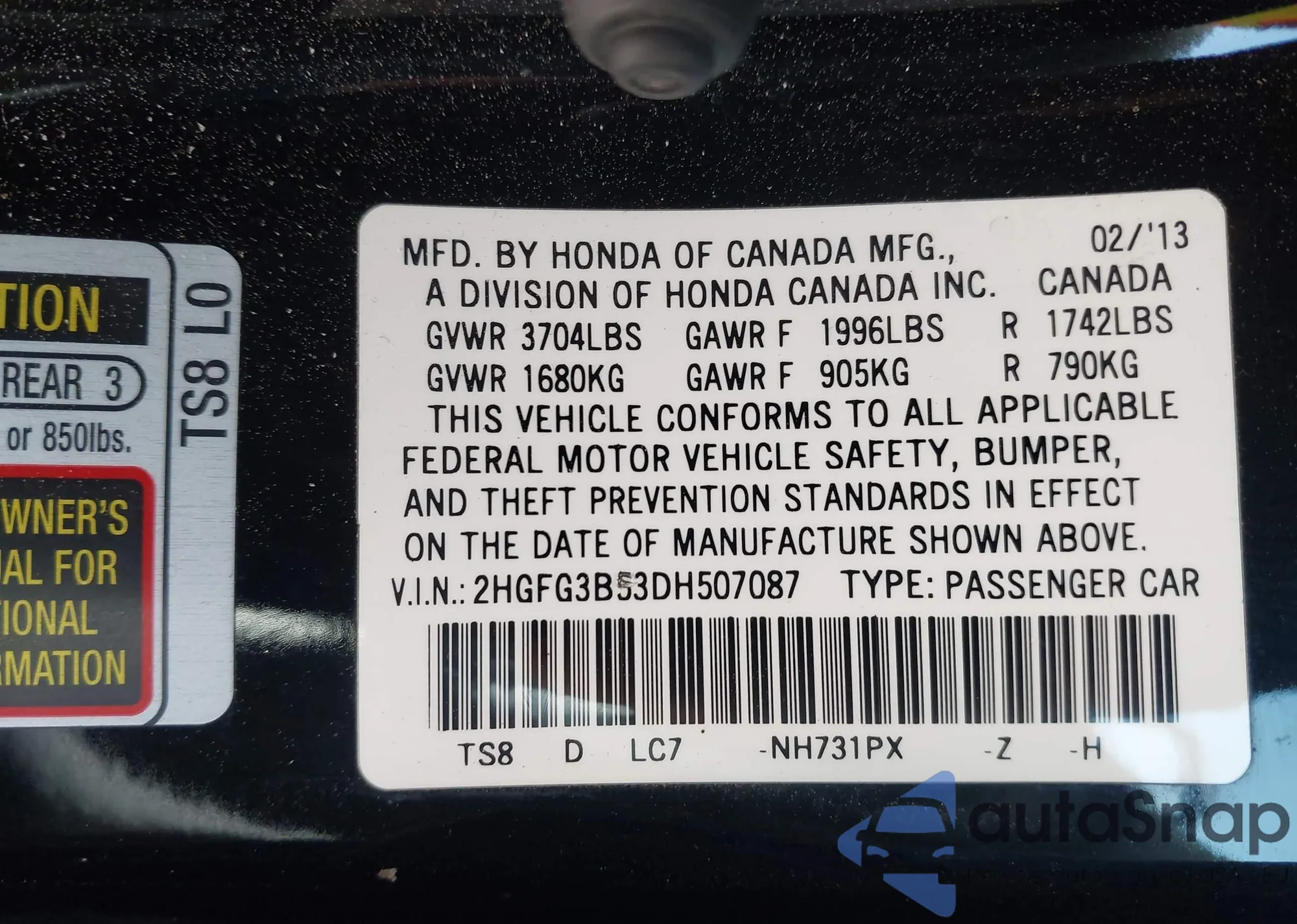 LOT: 42133508 VIN: 2HGFG3B53DH507087