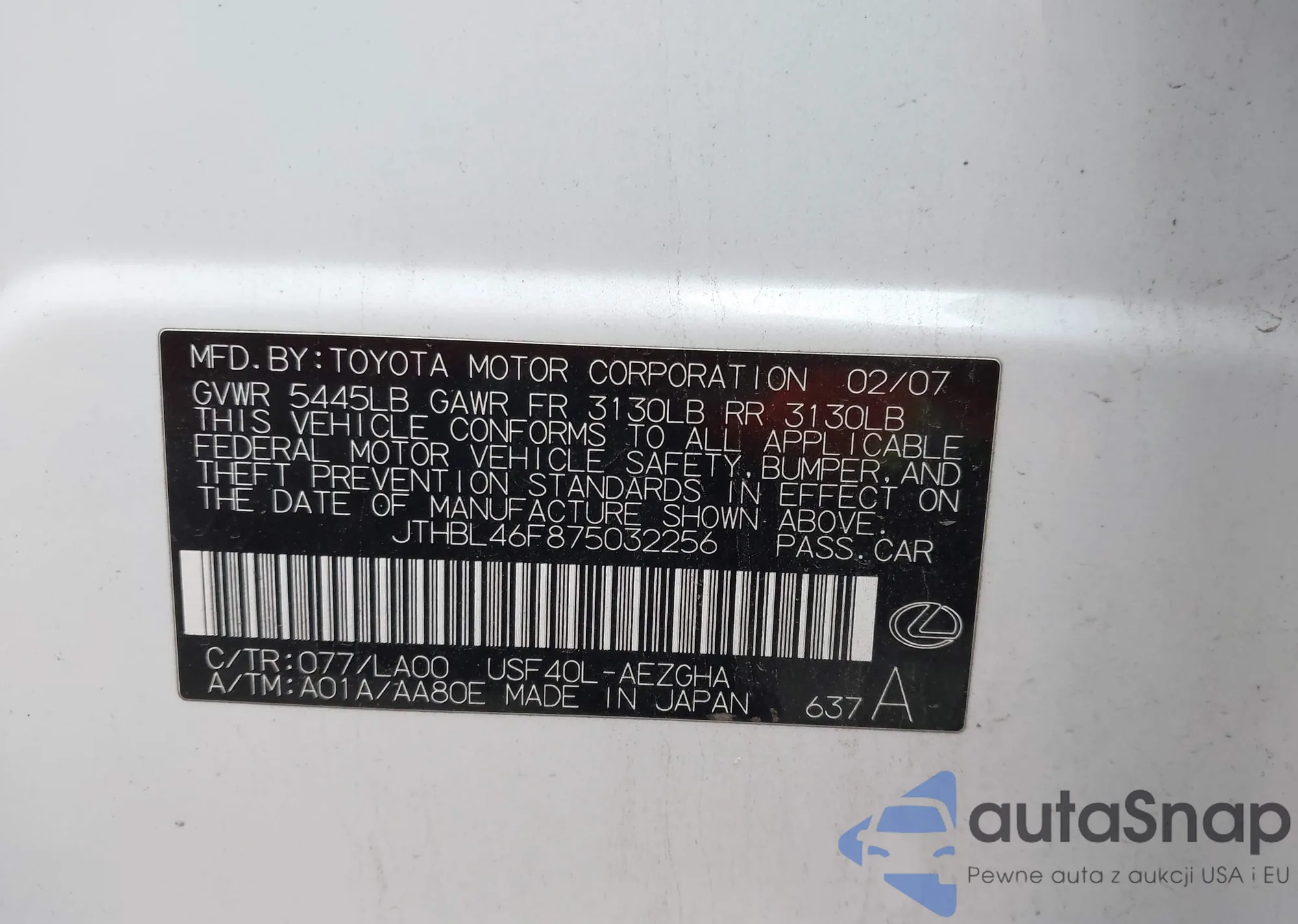 LOT: 42207987 VIN: JTHBL46F875032256