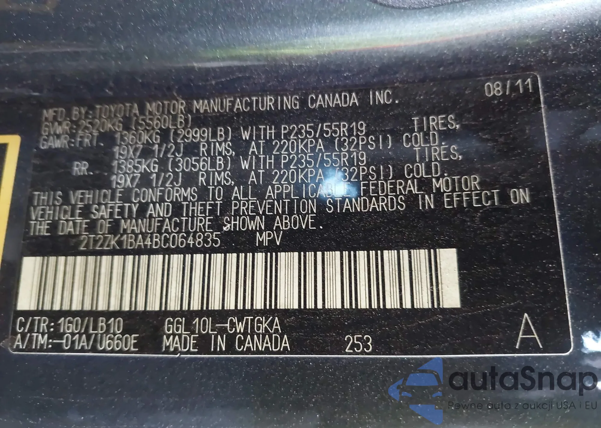 • VIN 2T2ZK1BA4BC064835