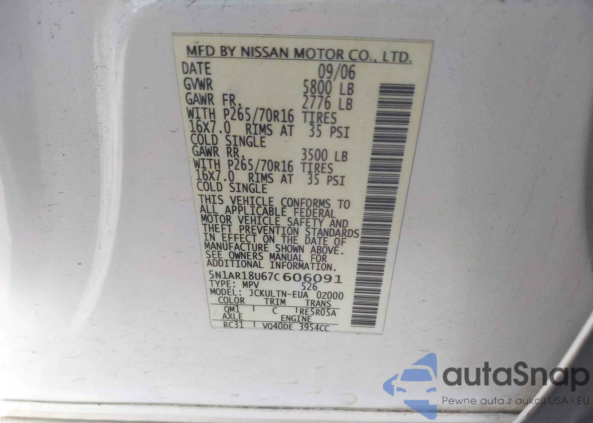 LOT: 42262734 VIN: 5N1AR18U67C606091