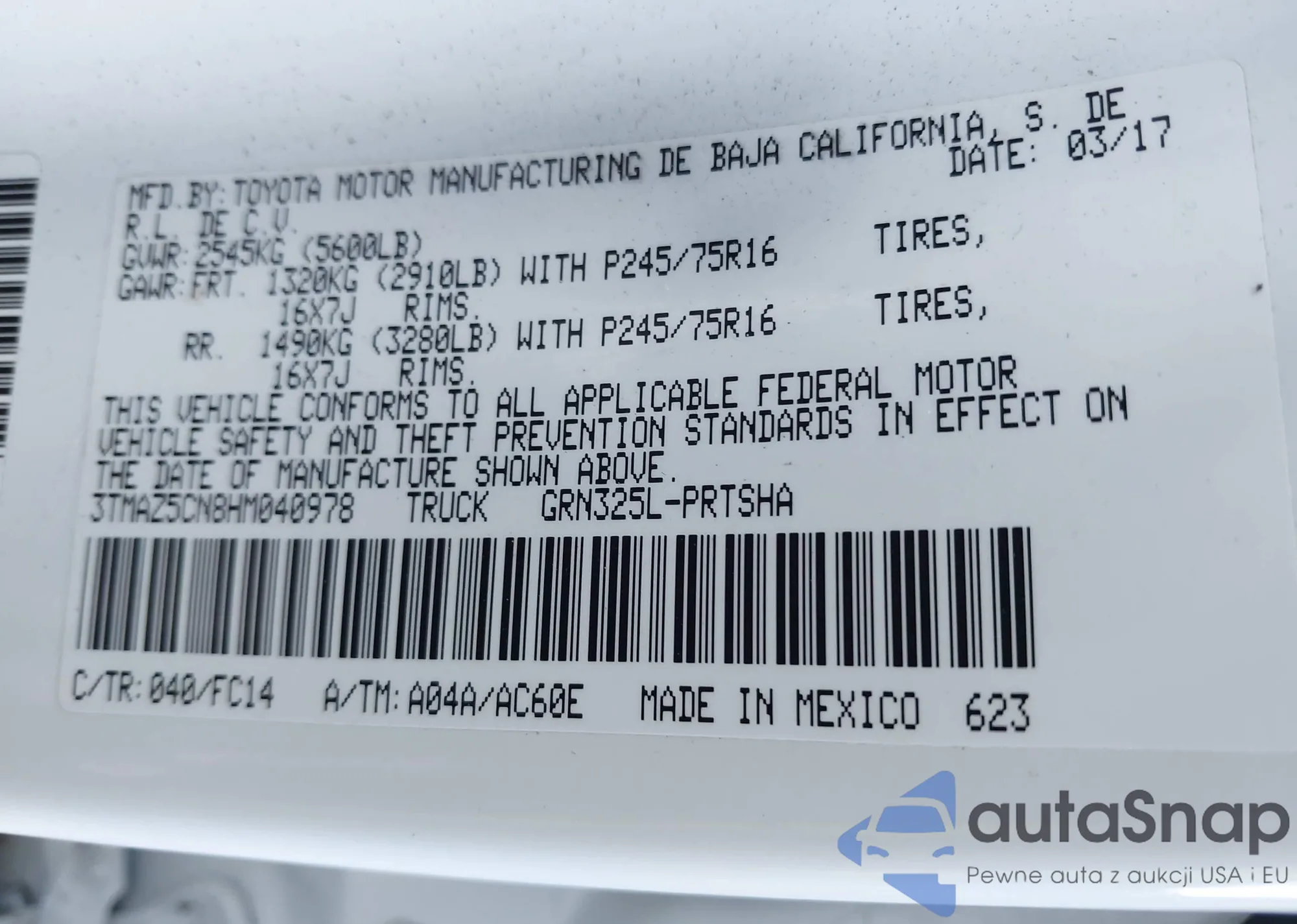 LOT: 41847492 VIN: 3TMAZ5CN8HM040978