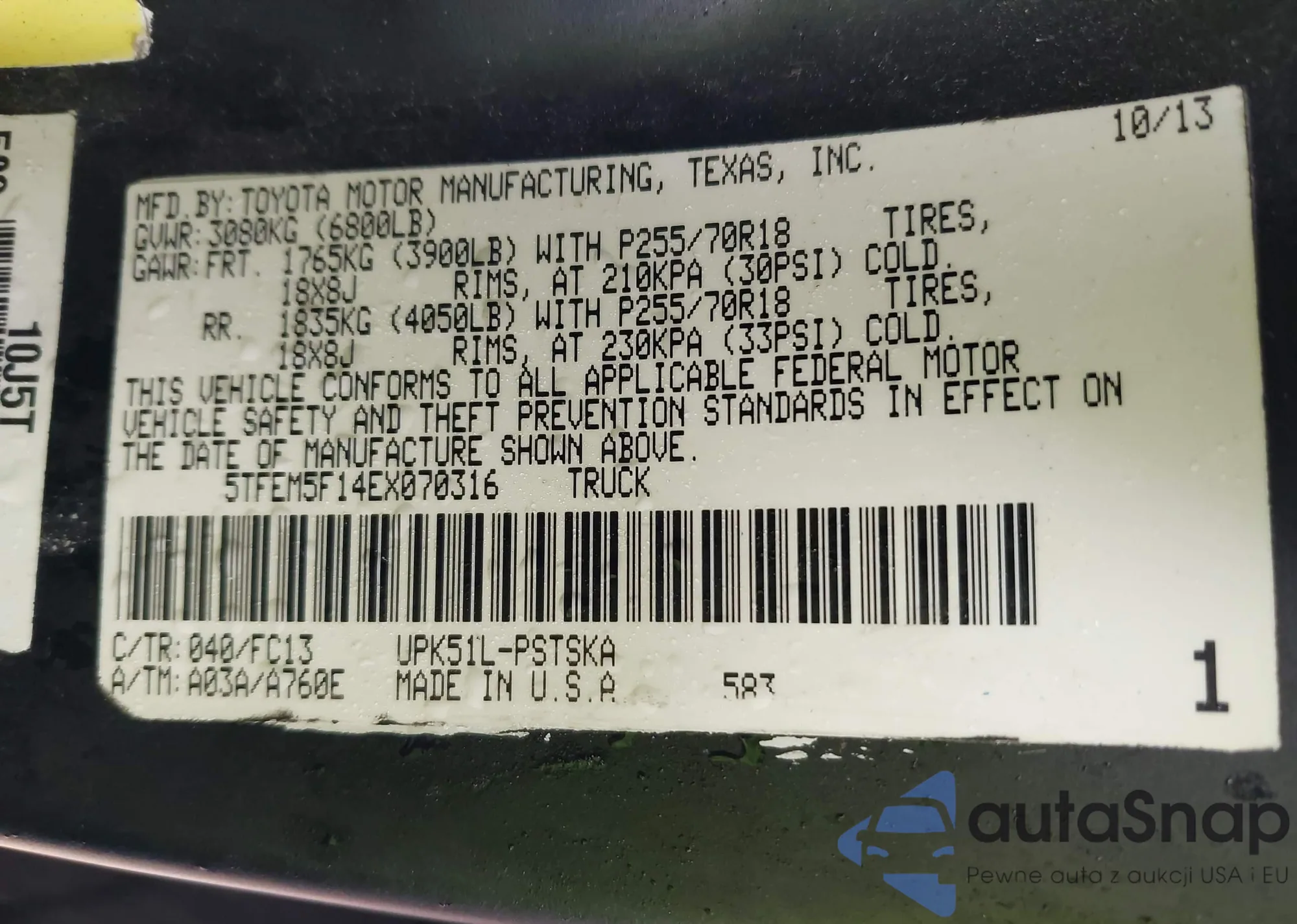 LOT: 42165446 VIN: 5TFEM5F14EX070316