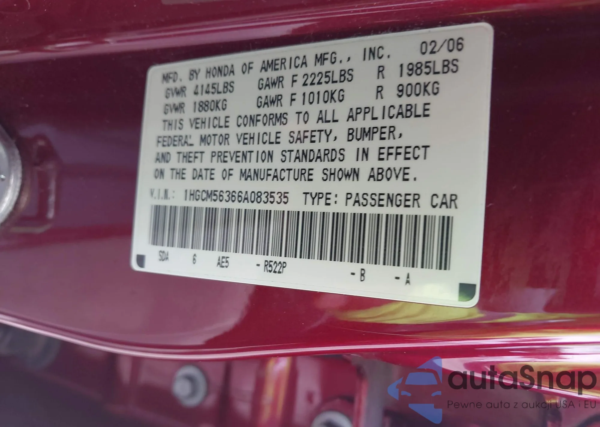 LOT: 42132912 VIN: 1HGCM56366A083535