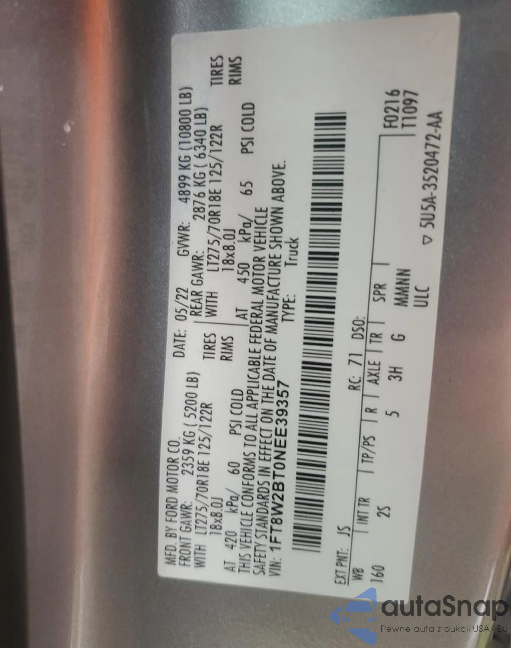 LOT: 72539004 VIN: 1FT8W2BT0NEE39357