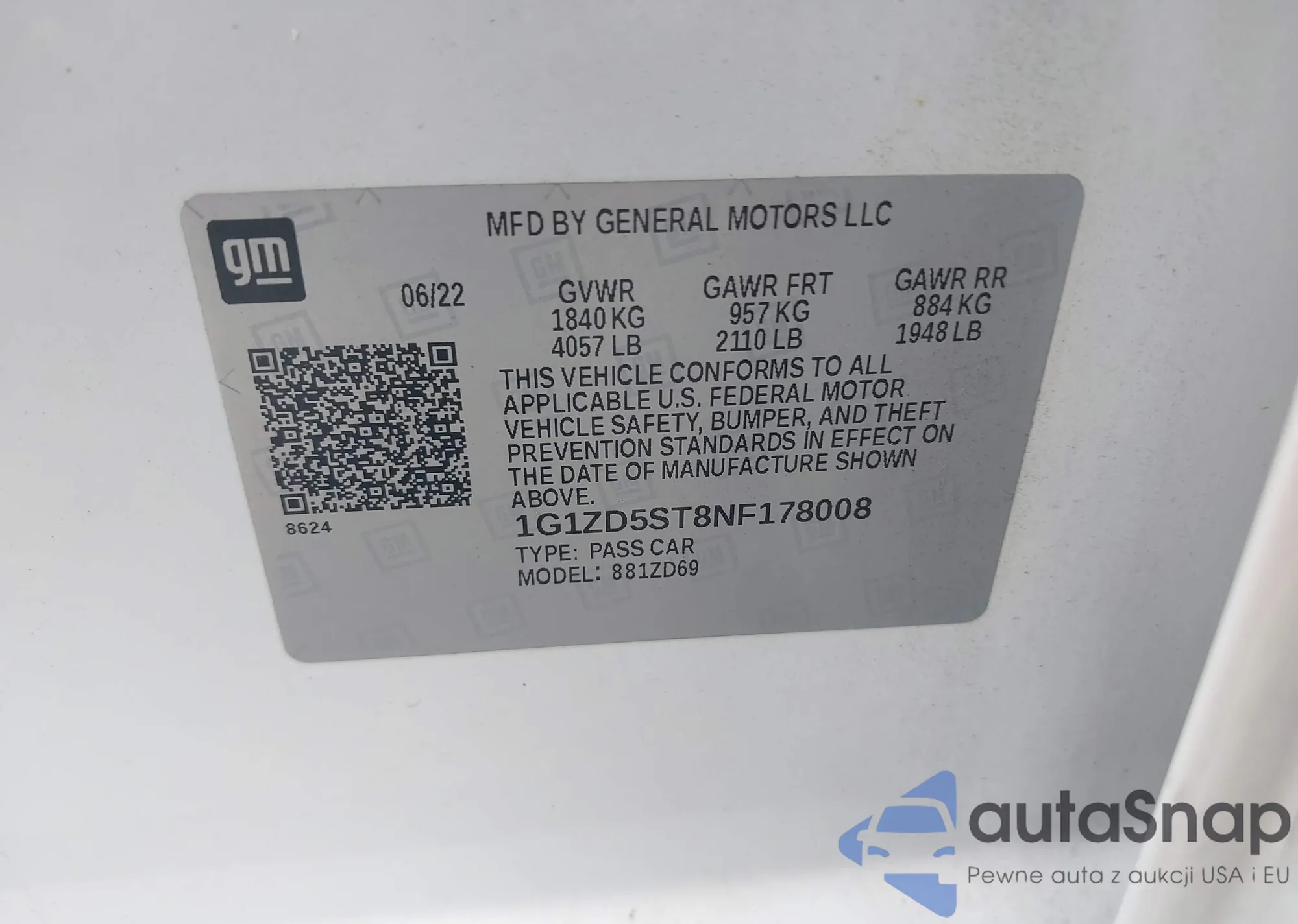 LOT: 39696967 VIN: 1G1ZD5ST8NF178008