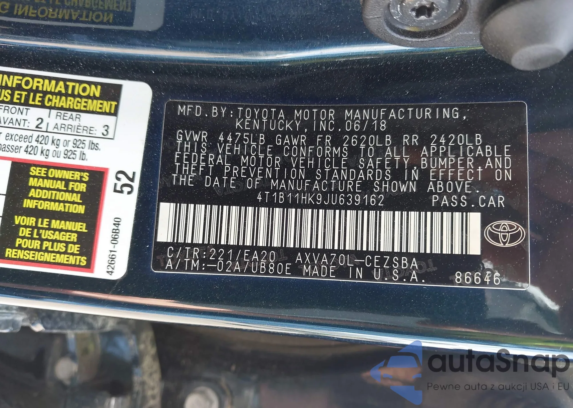 • VIN 4T1B11HK9JU639162
