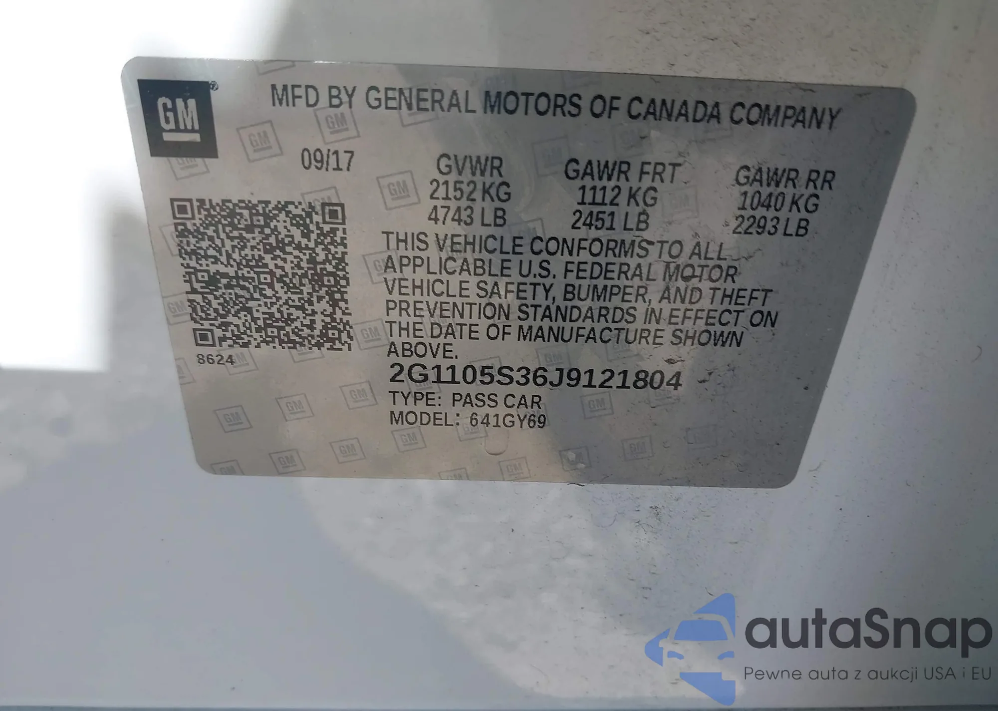 LOT: 42197191 VIN: 2G1105S36J9121804