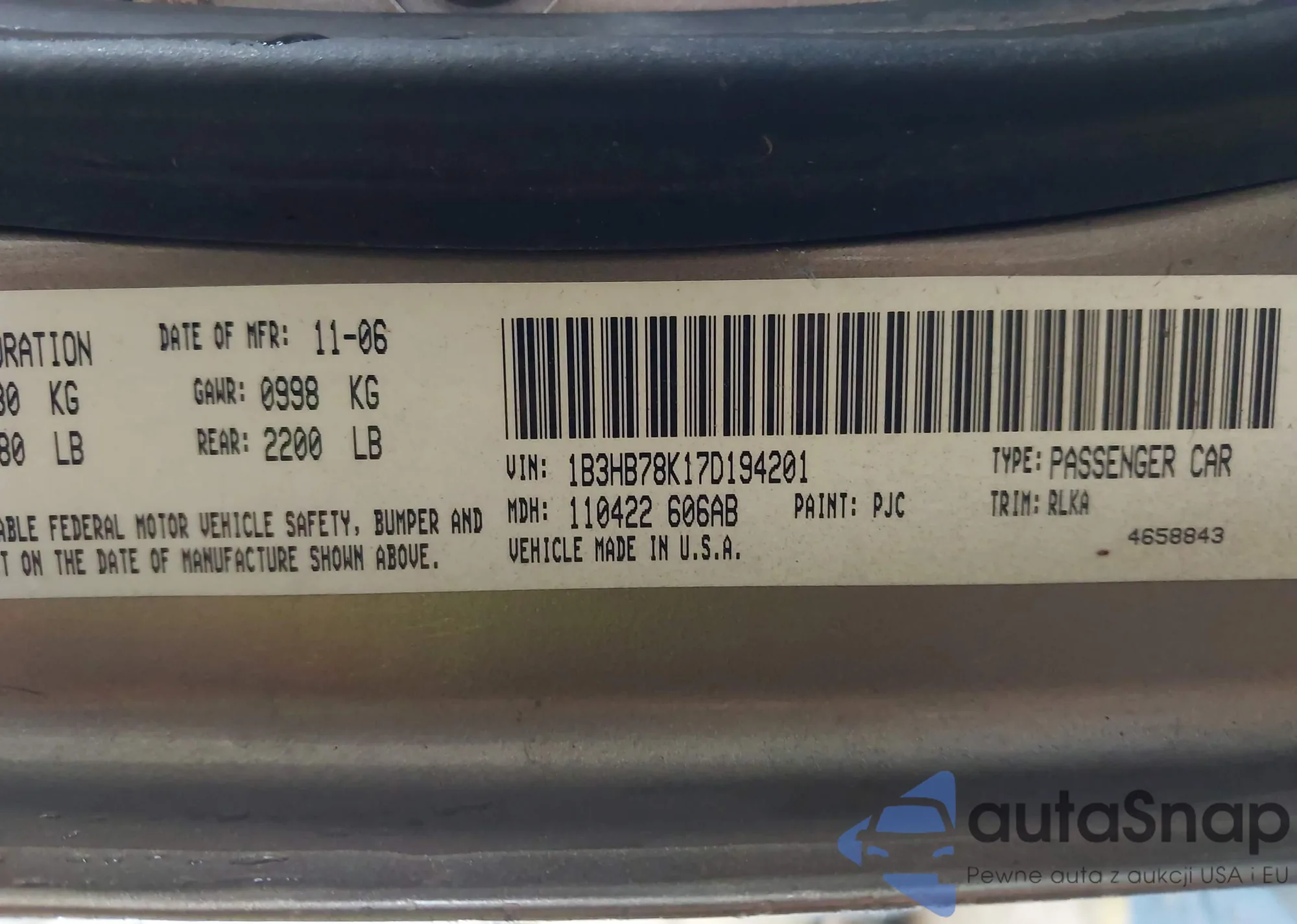 LOT: 42323189 VIN: 1B3HB78K17D194201