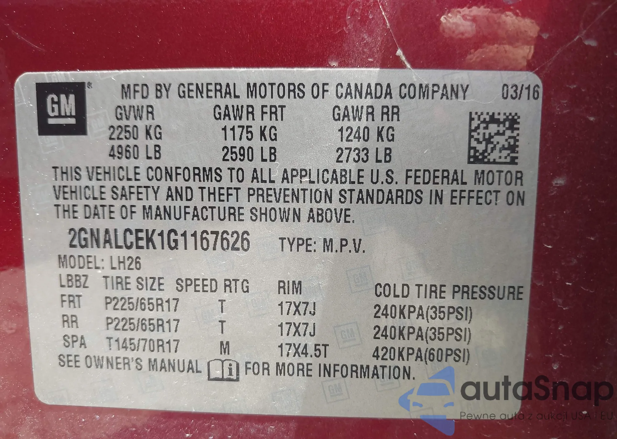 LOT: 42206121 VIN: 2GNALCEK1G1167626
