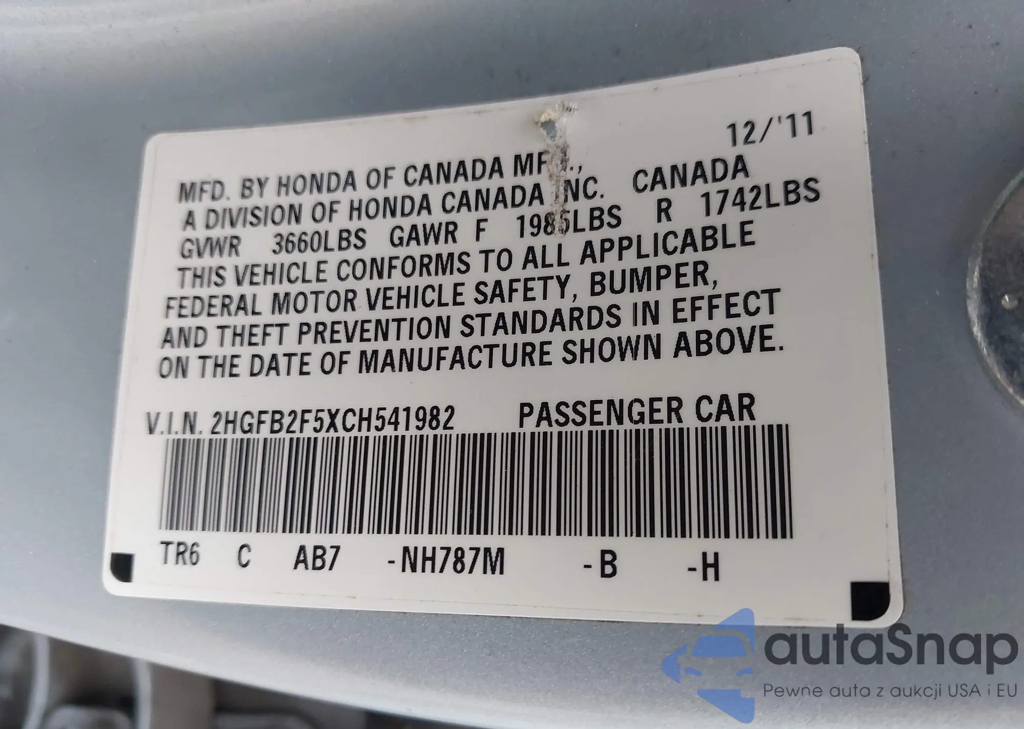 LOT: 42131800 VIN: 2HGFB2F5XCH541982
