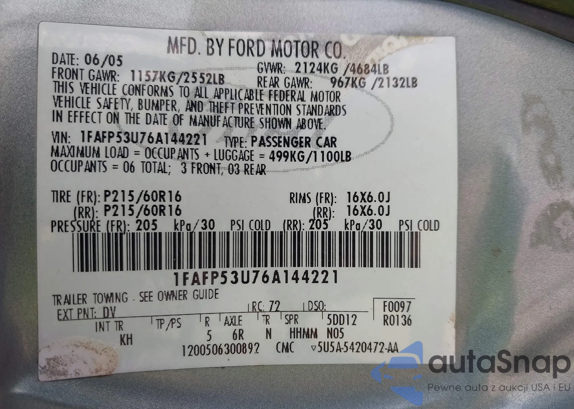 • VIN 1FAFP53U76A144221