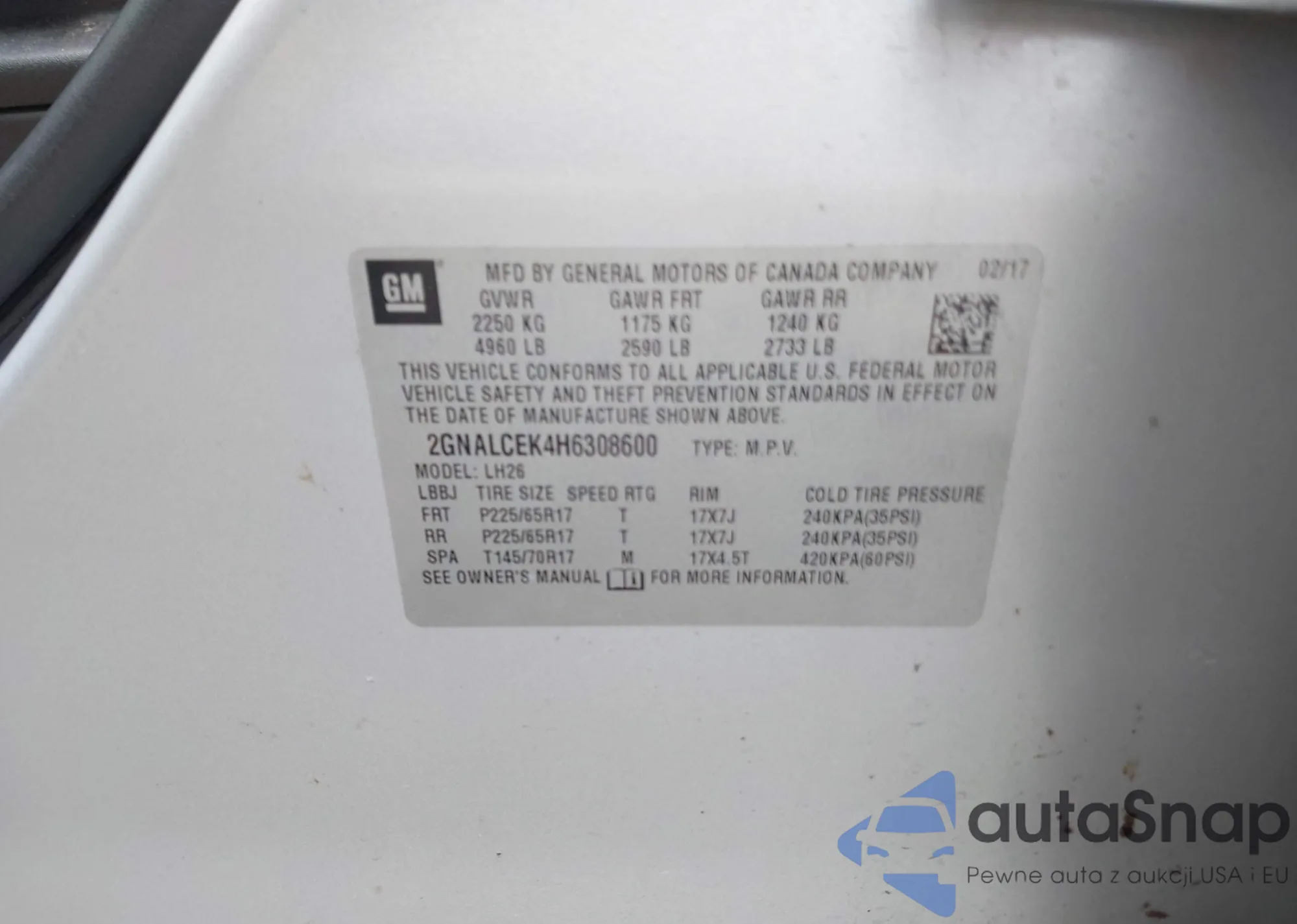 LOT: 41733762 VIN: 2GNALCEK4H6308600