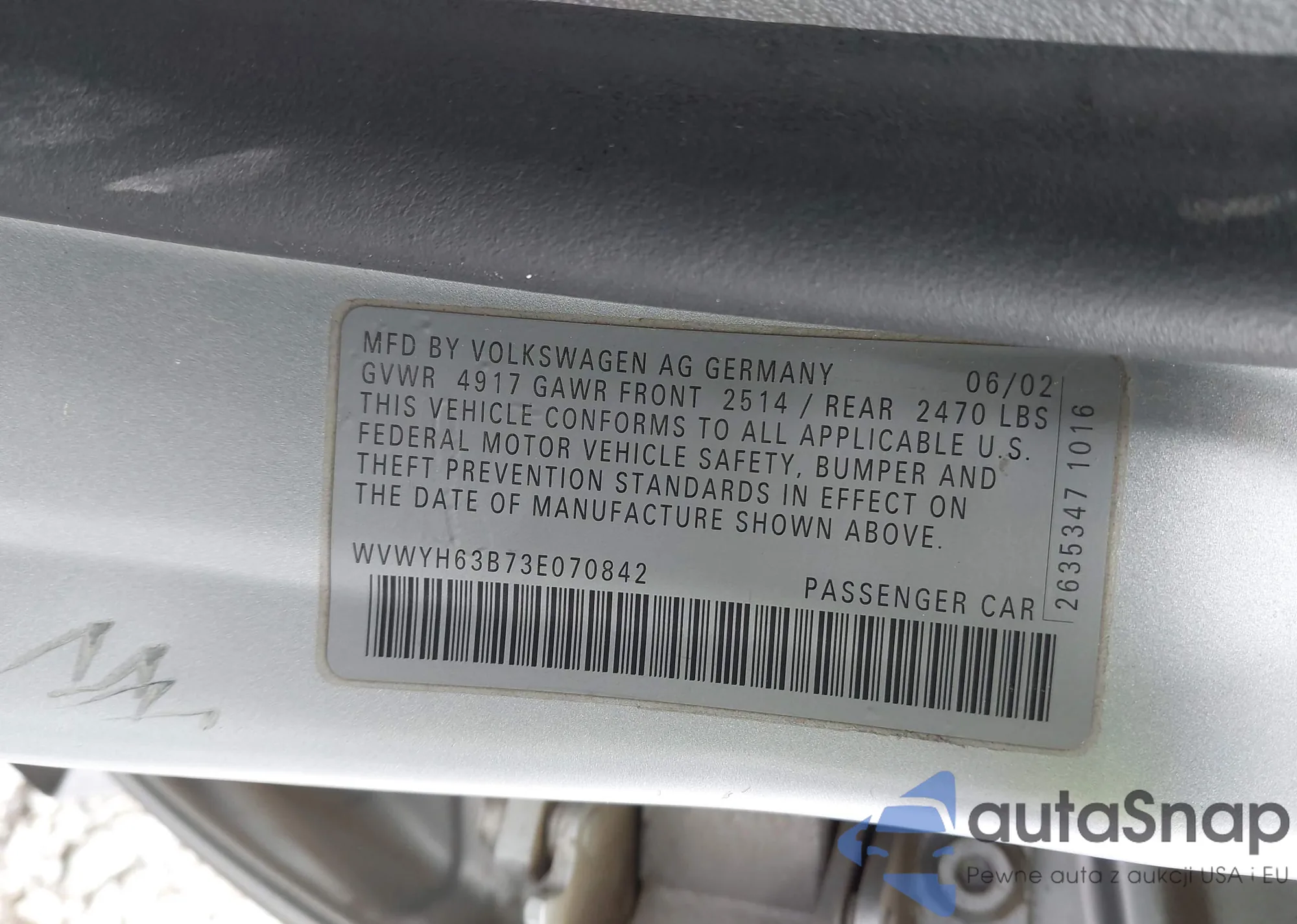 • VIN WVWYH63B73E070842