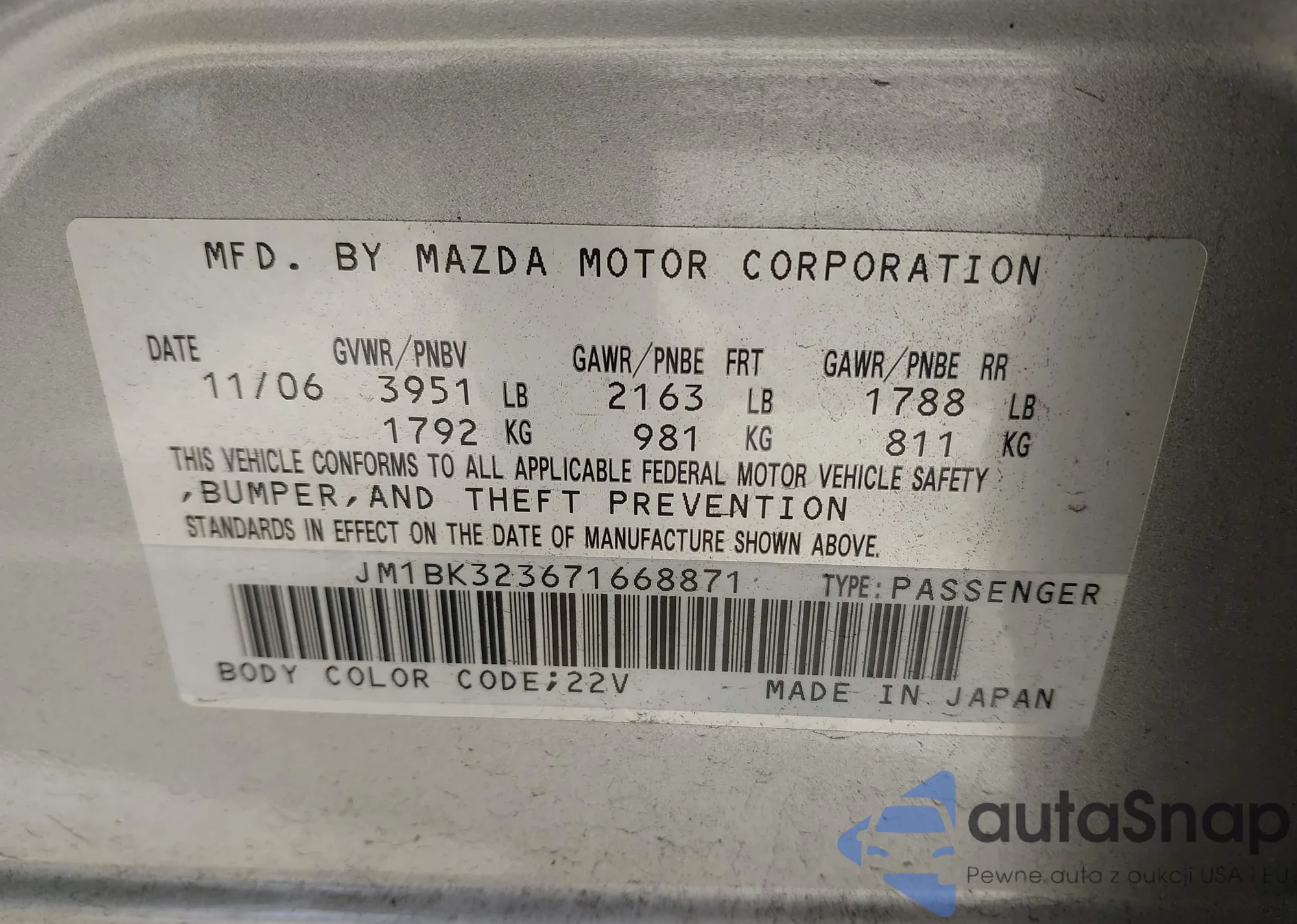 LOT: 42279385 VIN: JM1BK323671668871